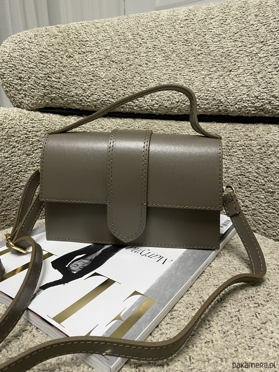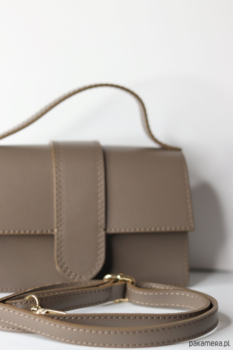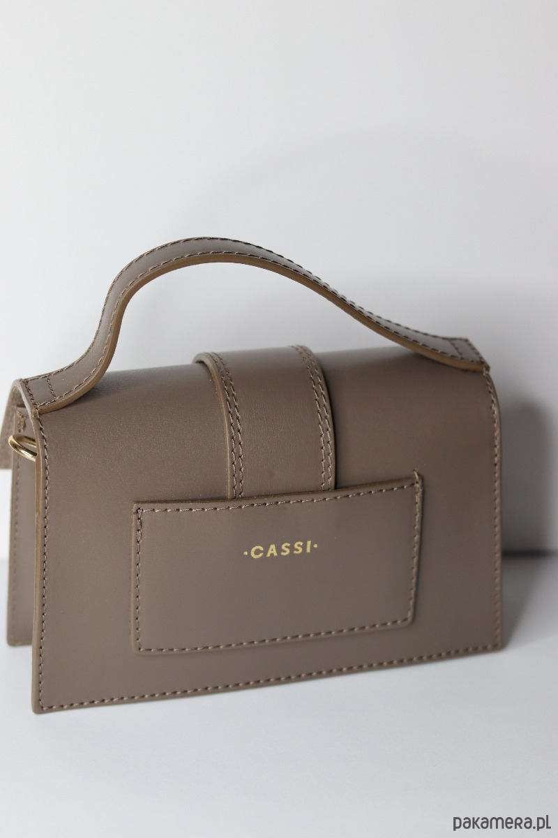 Torebka na ramię marki Cassi. Torebka zaprojektowana przez polska markę, uszyta we Włoszech. Wykonana jest ze skóry naturalnej, gładkiej w kolorze taupe/szary/brąz . Zamykana na magnetyczny zatrzask z tyłu wsuwana kieszeń z wybitą nazwą marki Cassi . Odpinany, regulowany cienki pasek na ramię. Wewnątrz jedna komora, oraz maleńka kieszonka. Okucia w kolorze złotym.