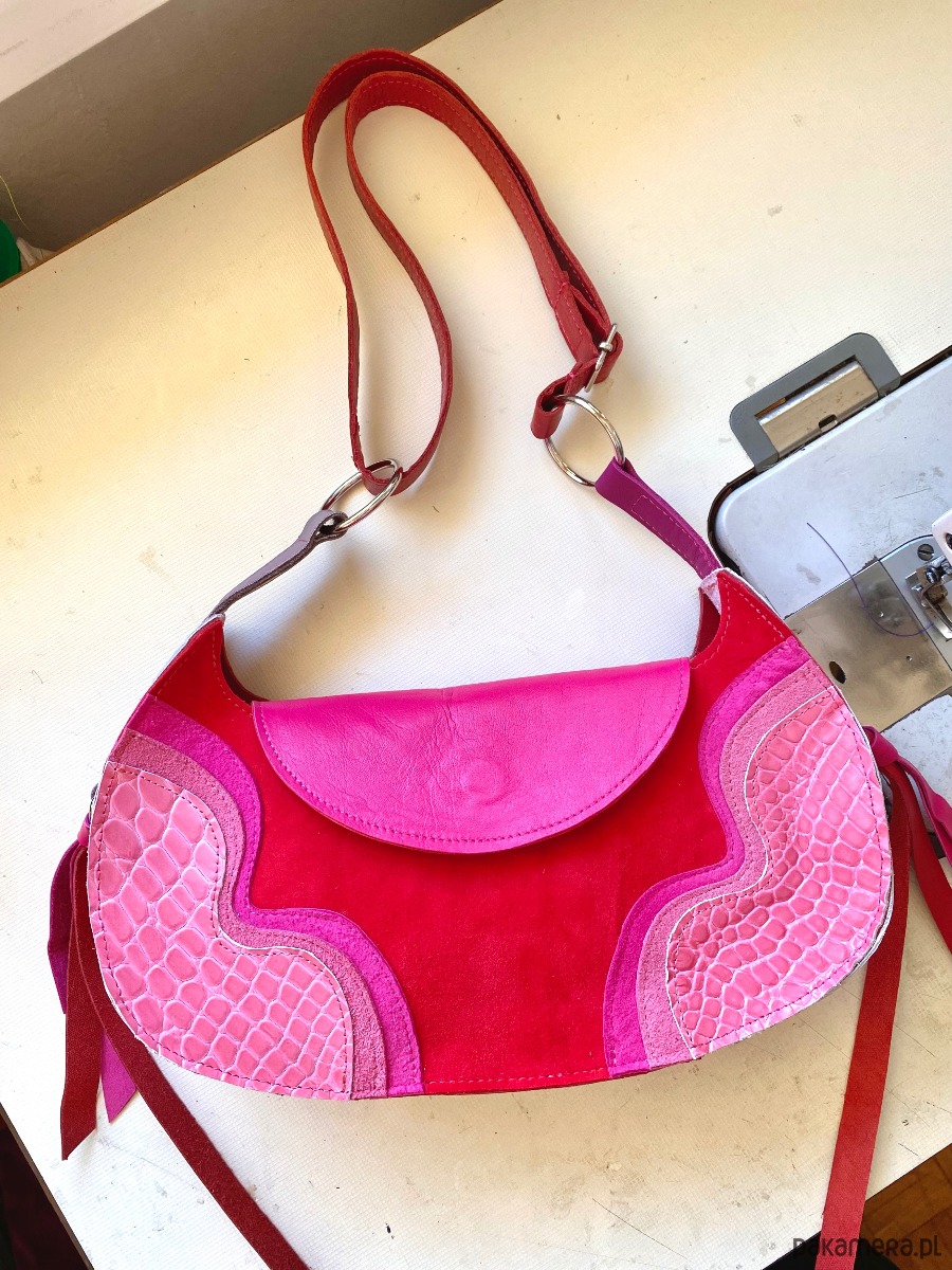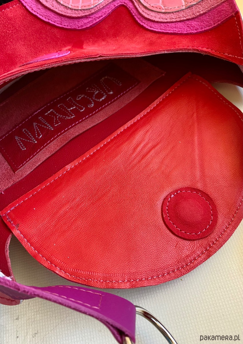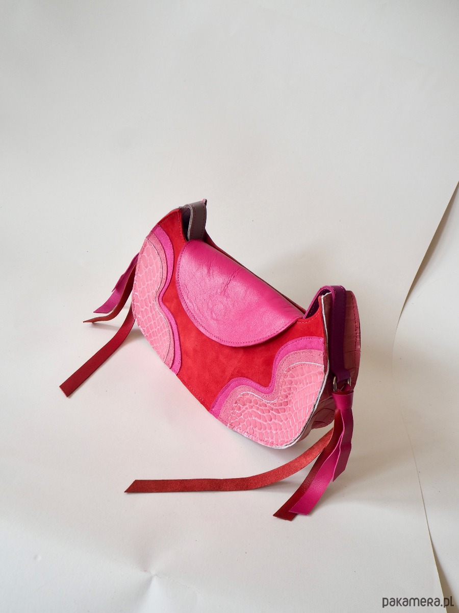 Torebka wykonana z różnych faktur i kolorów ścinek skóry naturalnej i zamszu z drugiego obiegu w kolorze różowo czerwonym. Z dodatkiem pięknej tłoczonej we wzór krokodyla skóry po bokach. Torba zapinana jest na magnes. Pasek jest regulowany, dzięki czemu można ją nosić przez głowę. Ten model jest idealny na najpotrzebniejsze rzeczy- portfel, telefon, klucze i np ładowarkę na telefon. Wewnątrz torebki znajduje się dodatkowa kieszonka.