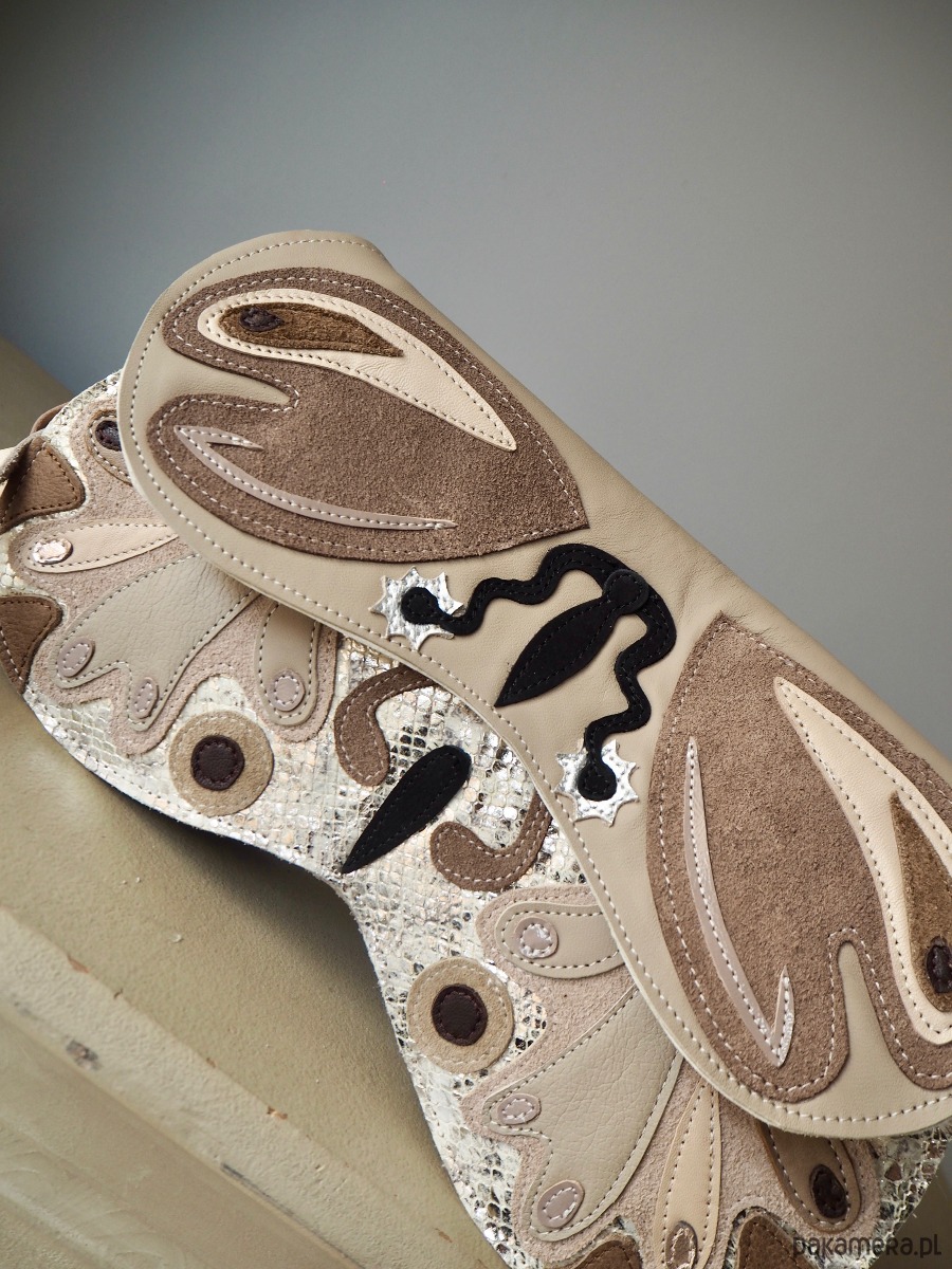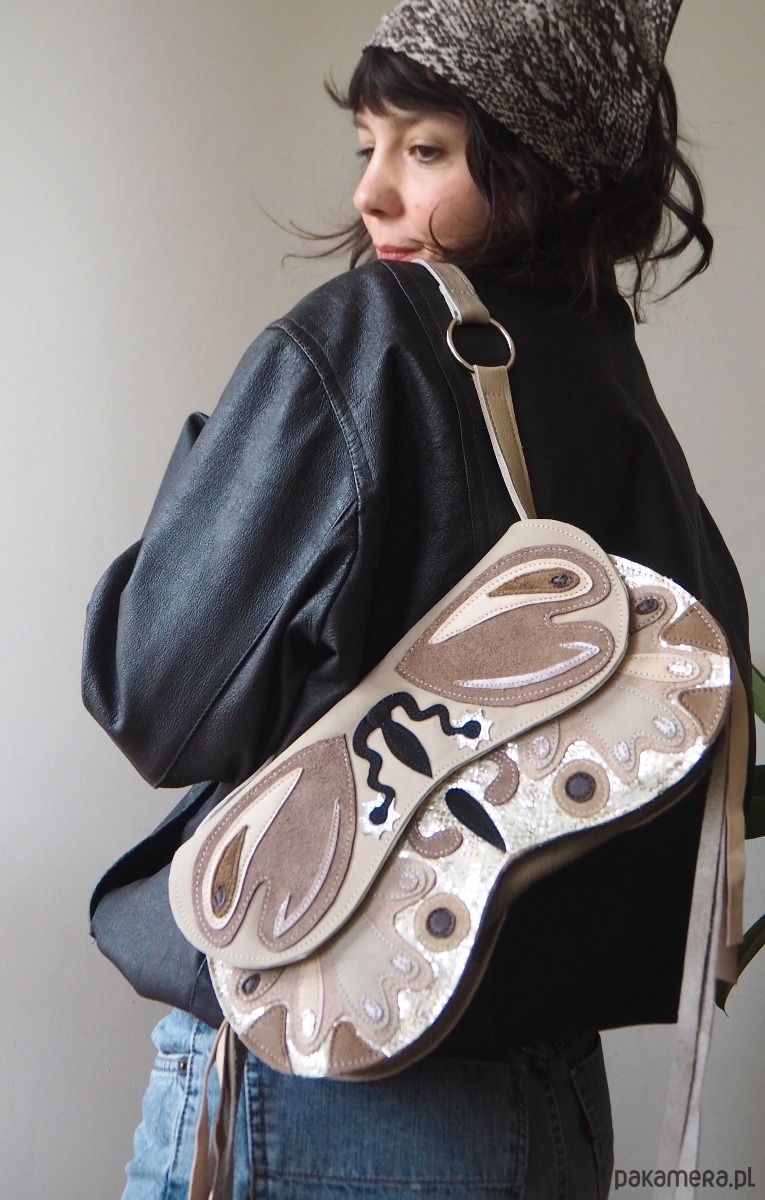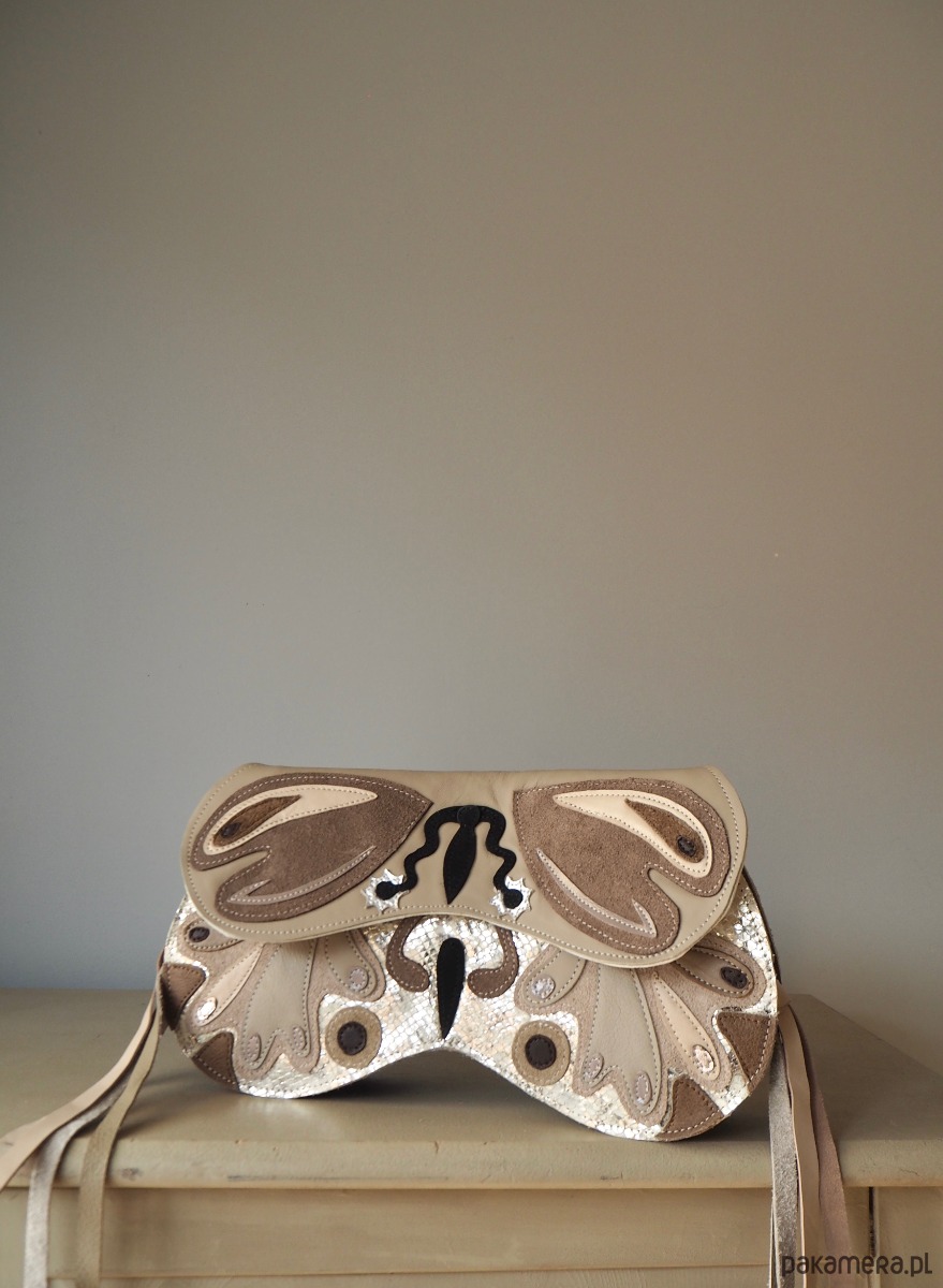 Torebka motyl wykonany jest głównie z beżowych ścinek skóry naturalnej i zamszu, niepowtarzalna i oryginalna. Po bokach są paseczki, nadają taki boho klimat. Torba zapinana jest na magnes. Pasek jest regulowany, dzięki czemu można ją nosić przez głowę. Ten model jest idealny na najpotrzebniejsze rzeczy- portfel, telefon, klucze i np ładowarkę na telefon, ale zmieści się też np mniejszy aparat fotograficzny czy kosmetyczka. Wewnątrz torebki znajduje się dodatkowa kieszonka.