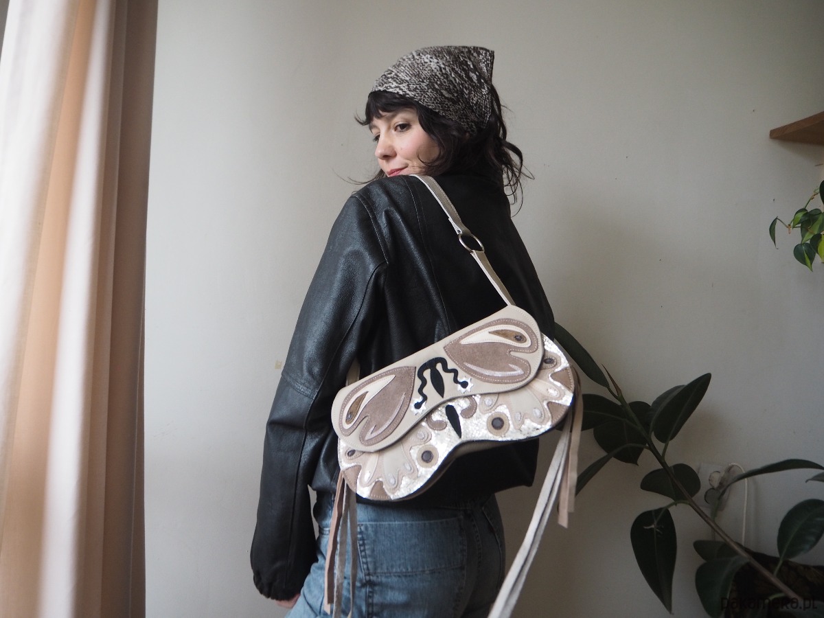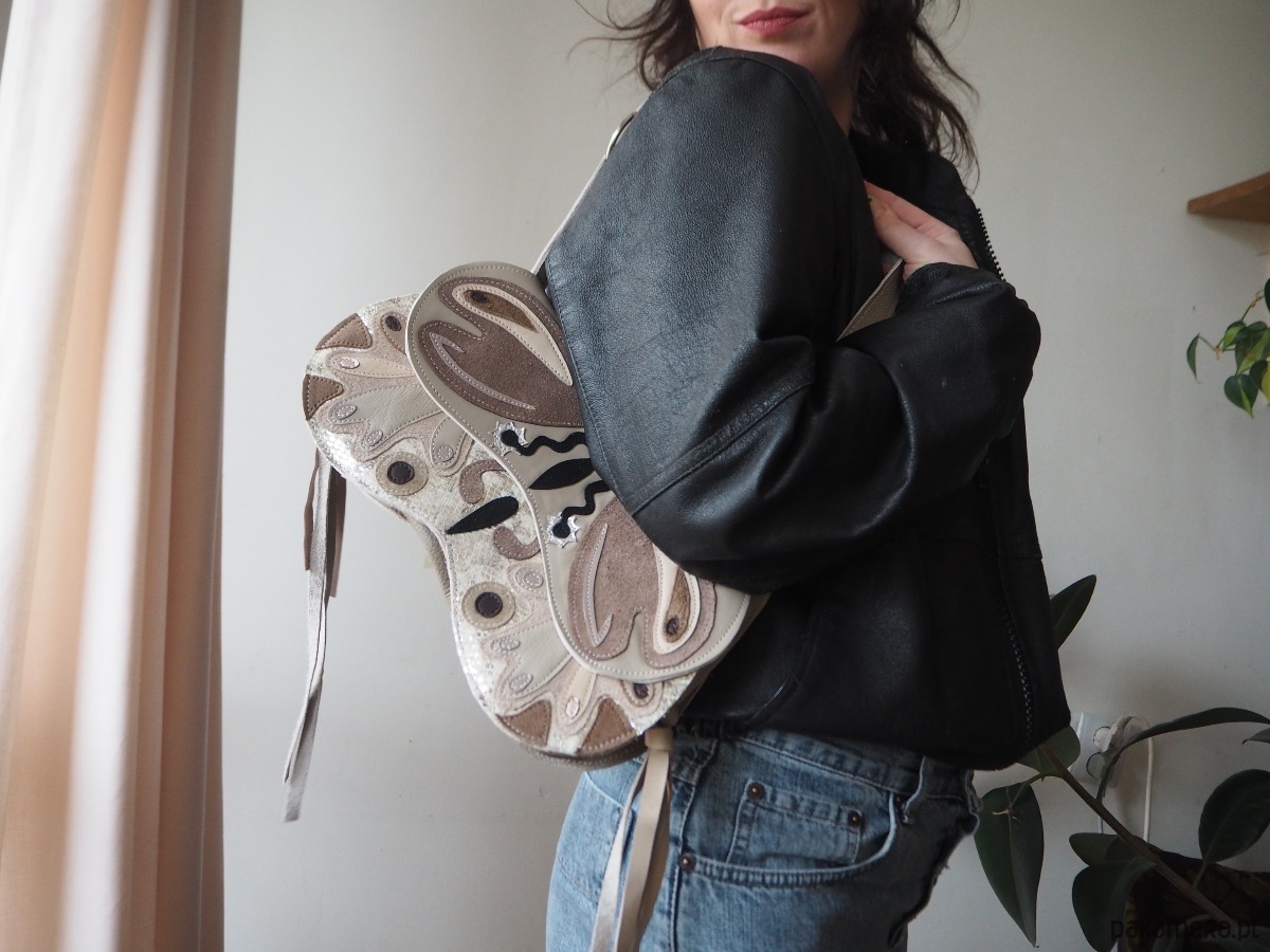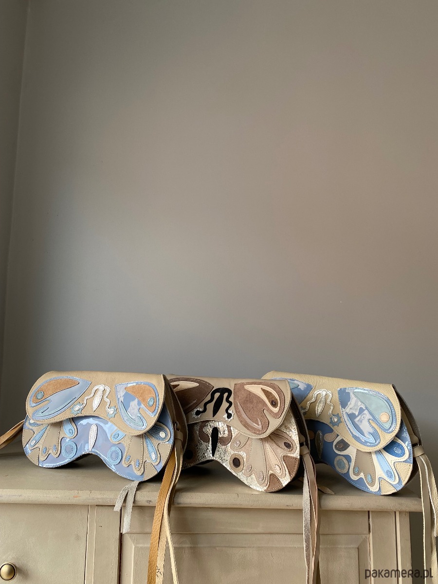 Torebka motyl wykonany jest głównie z beżowych ścinek skóry naturalnej i zamszu, niepowtarzalna i oryginalna. Po bokach są paseczki, nadają taki boho klimat. Torba zapinana jest na magnes. Pasek jest regulowany, dzięki czemu można ją nosić przez głowę. Ten model jest idealny na najpotrzebniejsze rzeczy- portfel, telefon, klucze i np ładowarkę na telefon, ale zmieści się też np mniejszy aparat fotograficzny czy kosmetyczka. Wewnątrz torebki znajduje się dodatkowa kieszonka.