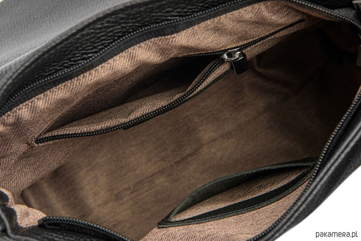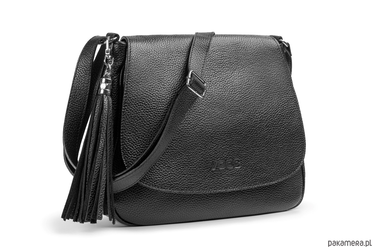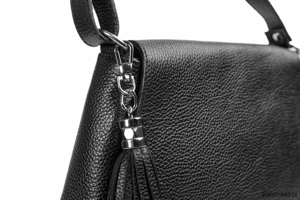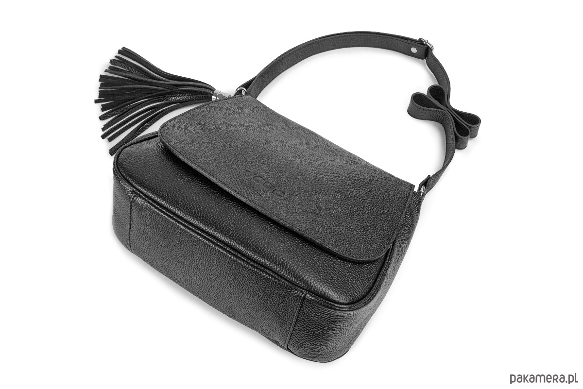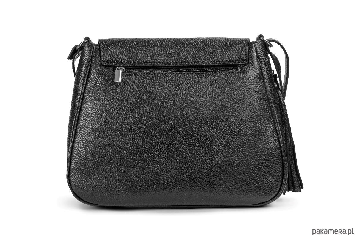 Klasyczna, duża, damska torebka uszyta z wysokiej jakości skóry naturalnej o strukturze groszkowej. Posiada jedną komorę, wyposażoną w dwie kieszonki. Jedną na telefon, drugą zamykaną na zamek błyskawiczny, w której schowasz dokumenty. Uroku torebce dodaje także ozdobny, zalotny frędzel/chwost, który można odpiąć. Tył torebki jest również wyposażony w praktyczna kieszeń zasuwaną na zamek. Wnętrze wykończone podszewką z mocnej, bawełnianej tkaniny. Posiada długi, regulowany pasek. Torebka mieści przedmioty w rozmiarze A5.