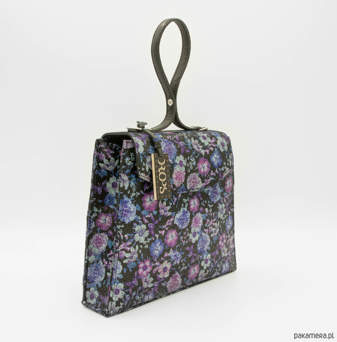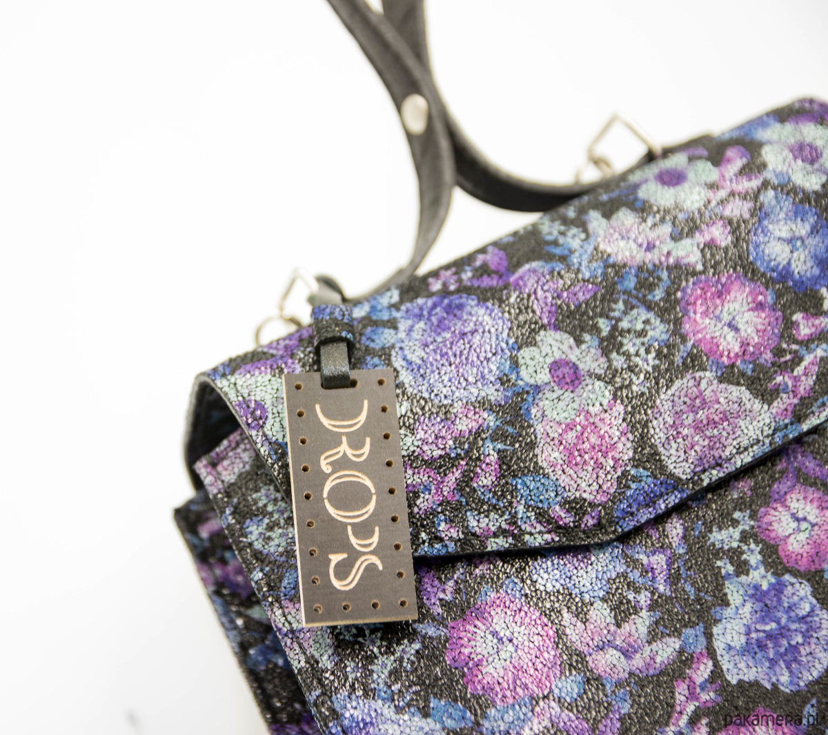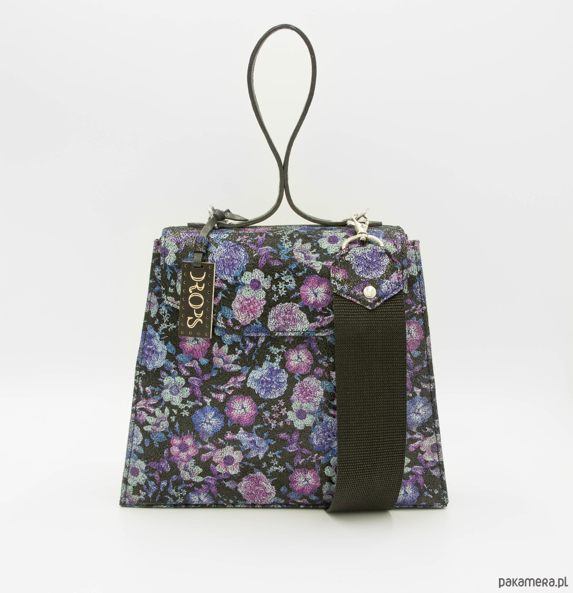 Poręczna i elegancka torebka uszyta ze skóry naturalnej. Torba będzie doskonałym dopełnieniem zarówno klasycznej stylizacji, jak i tej utrzymanej w najnowszych trendach. Torebka No. 5 wykonana jest ze skóry o pięknym kwiecistym wzorze utrzymanym w czarno-fioletowej kolorystyce. Wyjątkowego charakteru torebce dodaje rączka w kształcie pętelki. No. 5 można nosić w ręku jako elegancki dodatek lub doczepić szeroki pasek i przewiesić dla wygody przez ramię. Do torebki dołączona jest drewniana zawieszka z firmowym logo DROPS. Torebka No. 5 w całości szyta jest ręcznie. Produkt handmade.