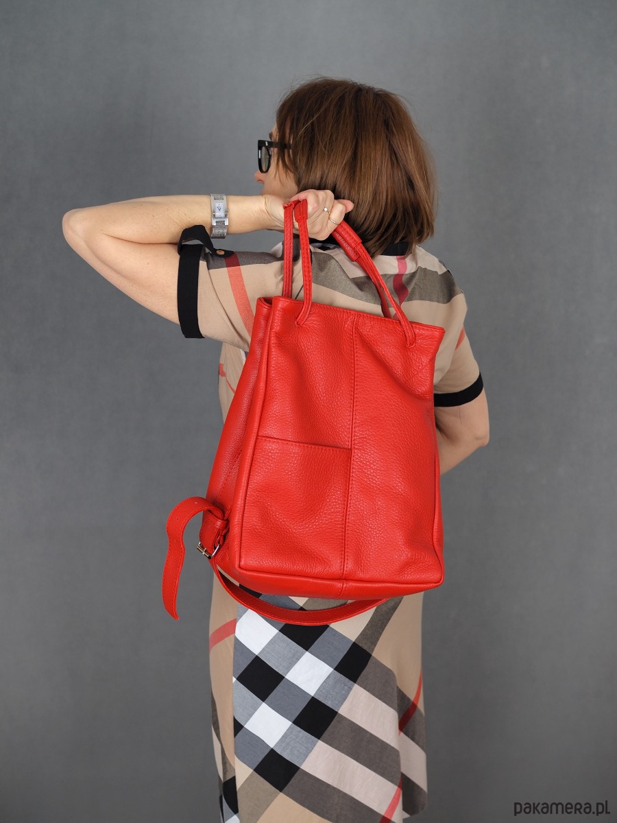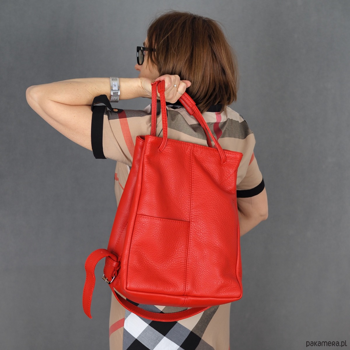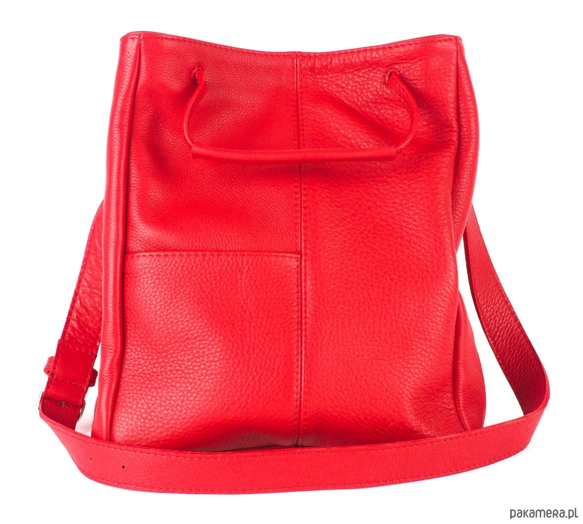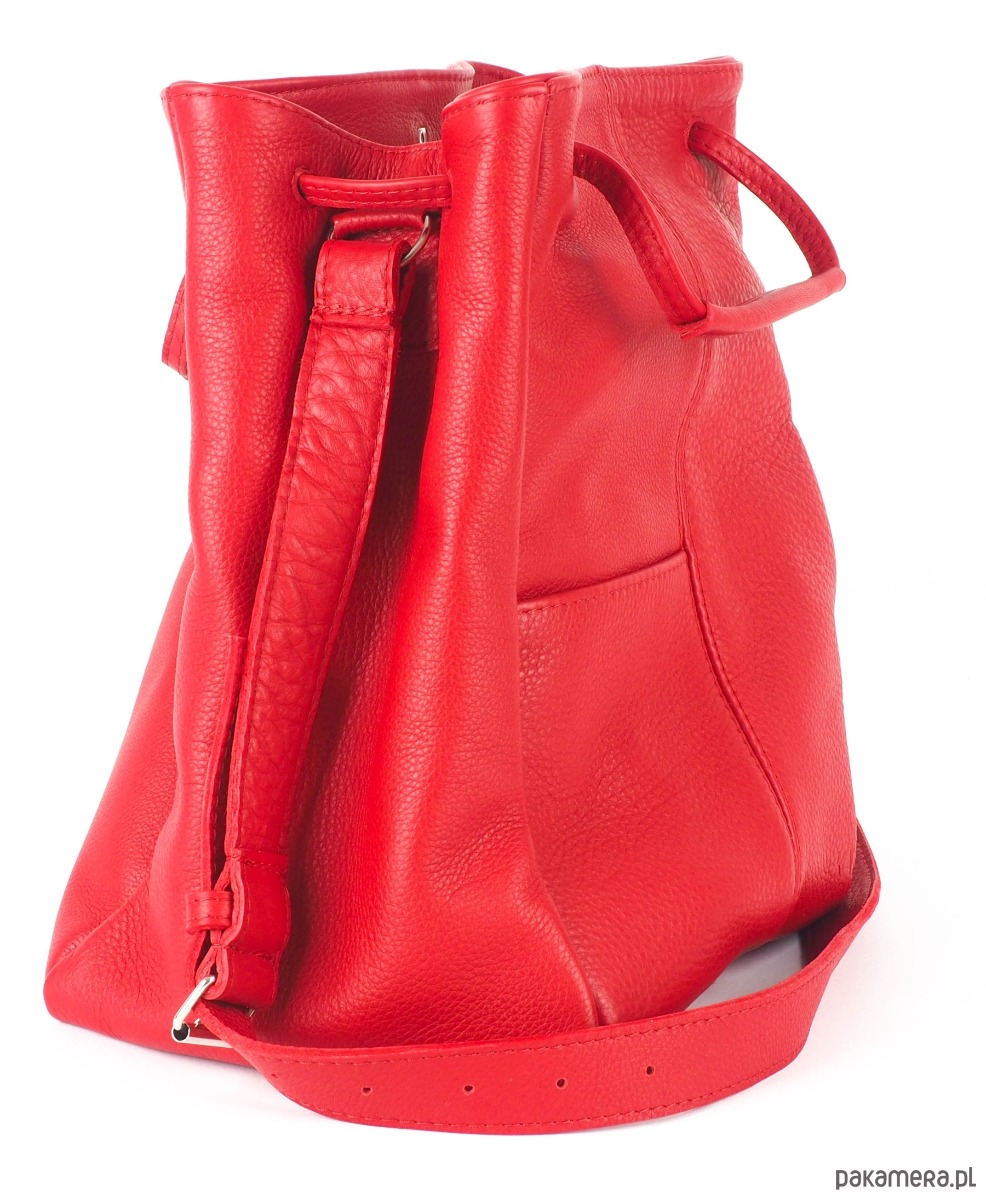 Klasyczny, ponadczasowy fason popularnej torby typu "bucket-bag" wykonanej z naturalnej skóry w kolorze czerwonym, sprawdzi się w każdej sytuacji. Minimalistyczna i bardzo wygodna torba, którą można nosić trzymając za rączki lub na ramieniu. Model wyposażony w kieszonkę zewnętrzną i wygodny, skórzany pasek o regulowanej długości. Podszewka w kolorze czerwonym. Świetnie zorganizowana, wewnątrz trzy głębokie kieszonki, jedna otwarta, jedna zapinana na suwak i jedna zapinana na zatrzask. Wyposażona dodatkowo w dwie smycze, do których możesz doczepić kosmetyczkę, brelok lub klucze, których nigdy już nie będziesz szukała w torebce!