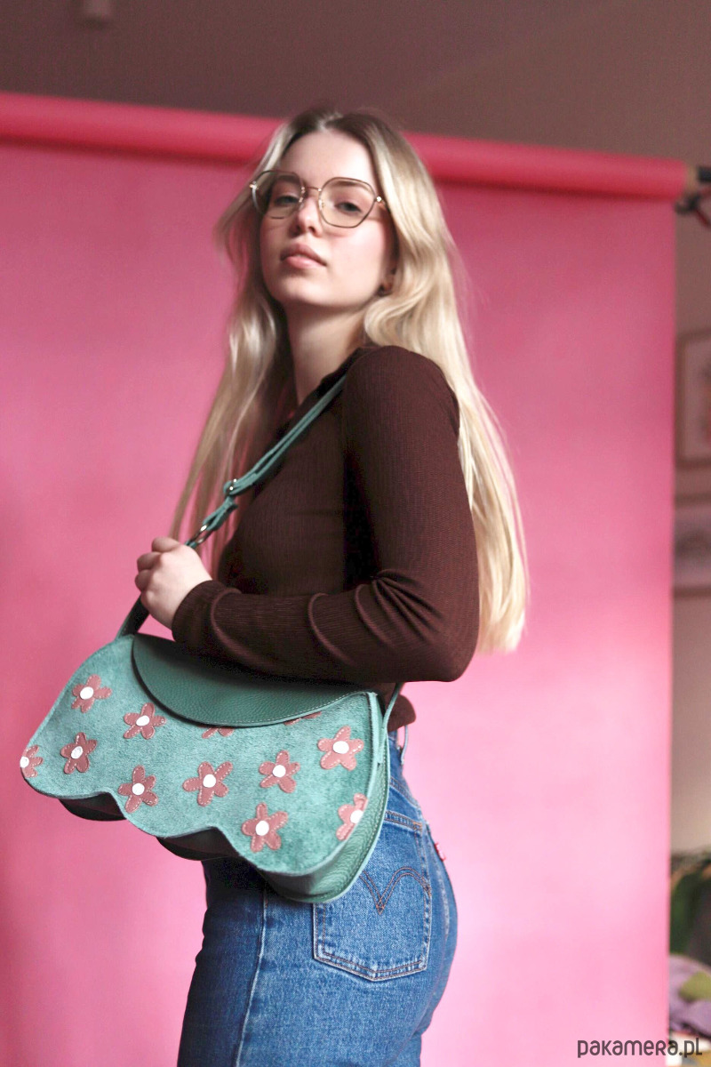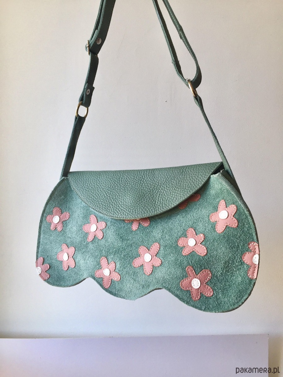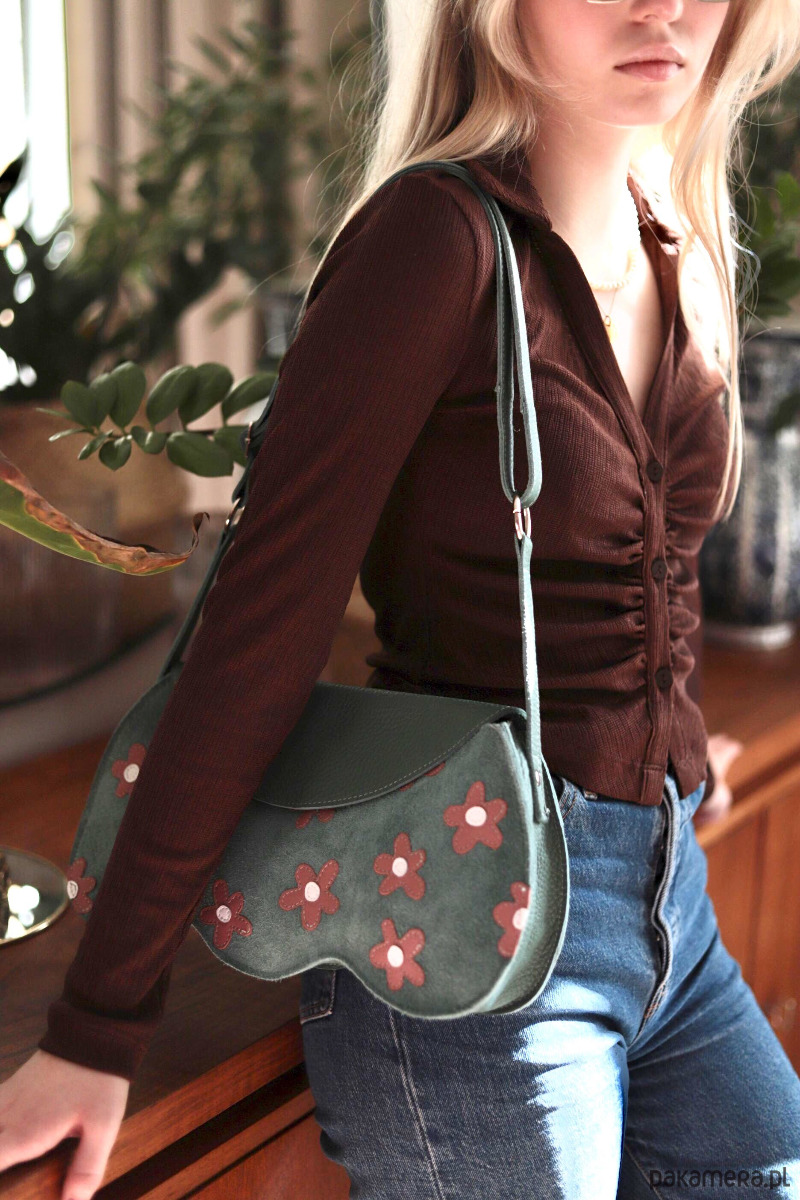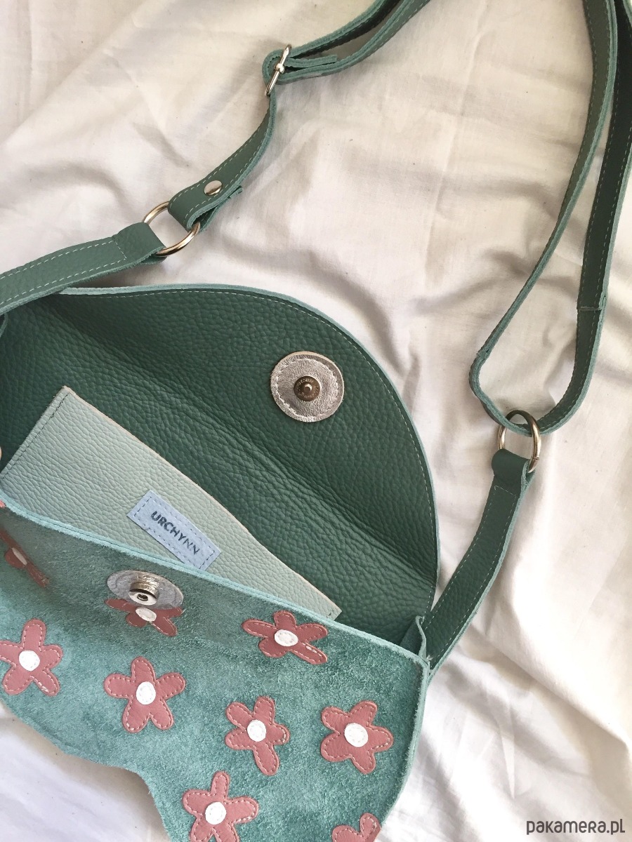 Torebka wykonana glównie z pięknej zielonej skóry. Torba zapinana jest na magnes. Pasek jest regulowany, dzięki czemu można ja nosić przez ramie. Ten model jest idealny na wszystkie najpotrzebniejsze rzeczy- portfel, telefon, klucze, chusteczki, mini kosmetyczkę i np ładowarkę na telefon, a nawet zmiesci się np niewielki aparat fotograficzny:) wewnątrz torebki znajduje się dodatkowa kieszonka.