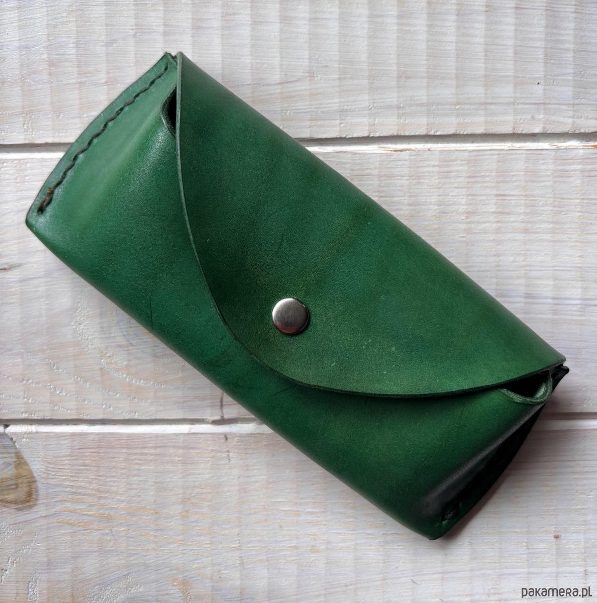 Elegancja w prostocie – to etui na okulary w kolorze butelkowej zieleni, wykonane z wysokiej jakości skóry bydlęcej licowej garbowanej roślinnie, która zyskała charakter dzięki ręcznemu barwieniu i szyciu. Dzięki klasycznemu kształtowi i ponadczasowemu stylowi, etui będzie doskonałym dodatkiem do każdej stylizacji. Idealne jako prezent dla bliskiej osoby, która ceni unikalne, ręcznie wykonane przedmioty.