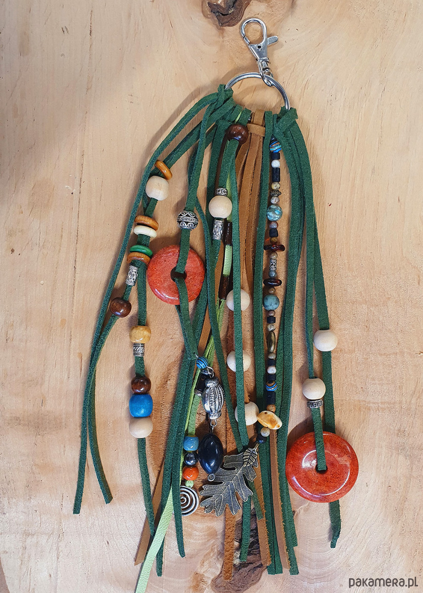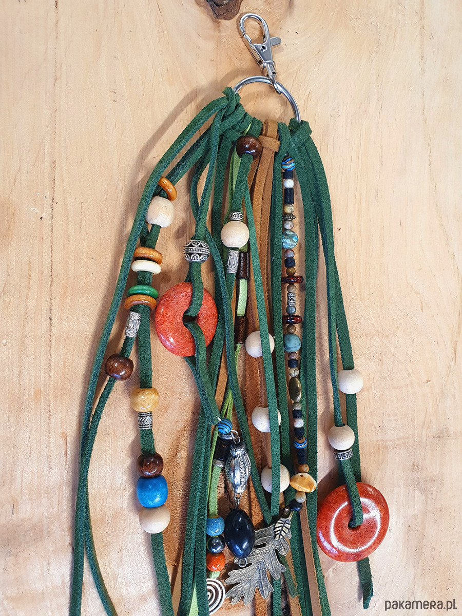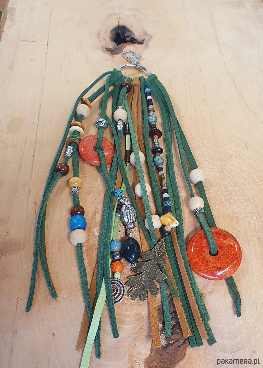 Długi brelok wykonany z rzemieni z cielęcej skóry i koralików z drewna , metalu i ceramiki i półszlachetnych turkusów oraz duże koło z koralu.