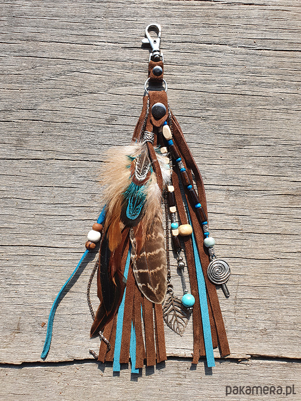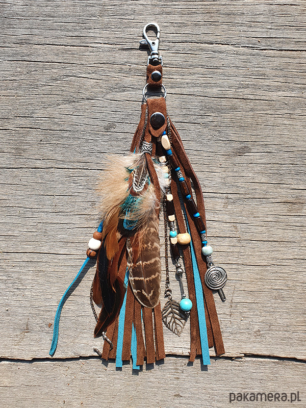 Brelok do kluczy, lub zawieszka do torebki, wykonany z rzemieni z cielęcej skóry i koralików szklanych, ceramicznych, metalowych i półszlachetnego turkusu., wykorzystałam również pióra naturalne różnych gatunków ptaków.