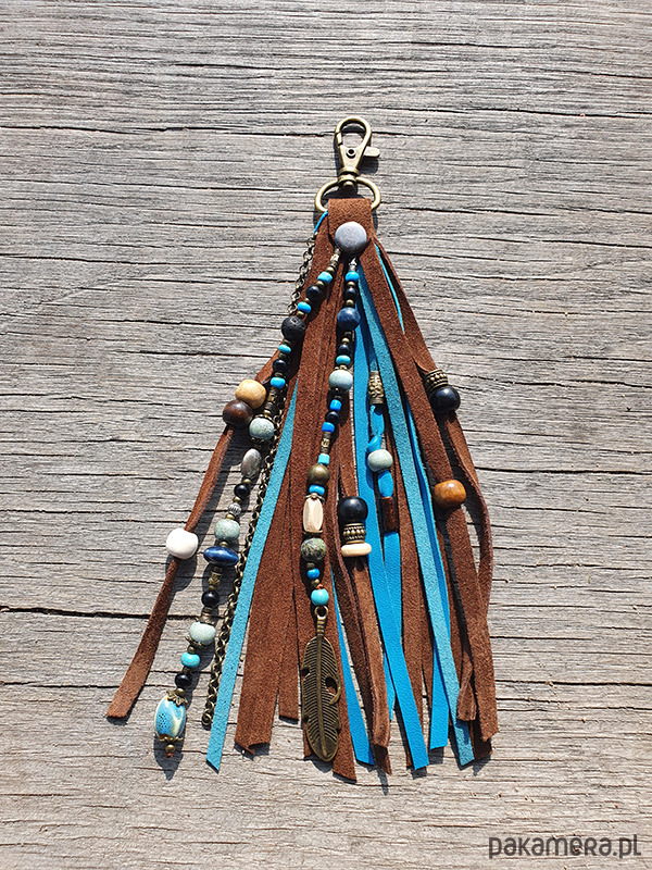 Brelok do kluczy, lub zawieszka do torebki, wykonany z rzemieni z cielęcej skóry i koralików szklanych, ceramicznych, metalowych i półszlachetnego turkusu i sodalitu.