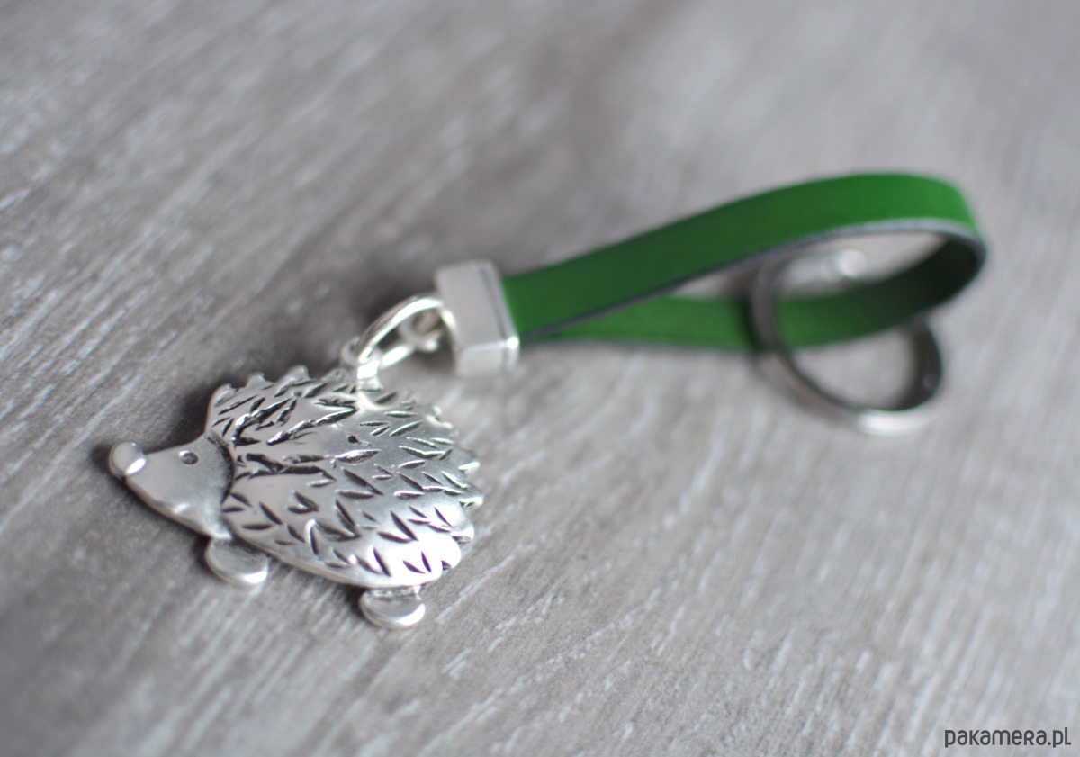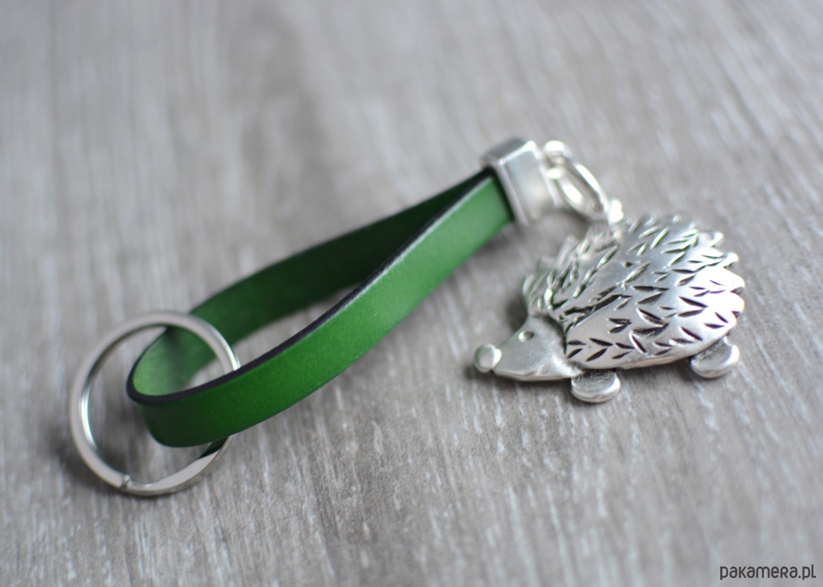 Brelok do kluczy wykonany z płaskiego, skórzanego rzemienia o szerokości 1cm w kolorze zielonym oraz elementów cynowych. Ozdobę breloka stanowi duża, zawieszka w kształcie jeża (45x36mm). Do umocowania kluczy służy okrągłe, solidne kółko o średnicy ok. 3cm.