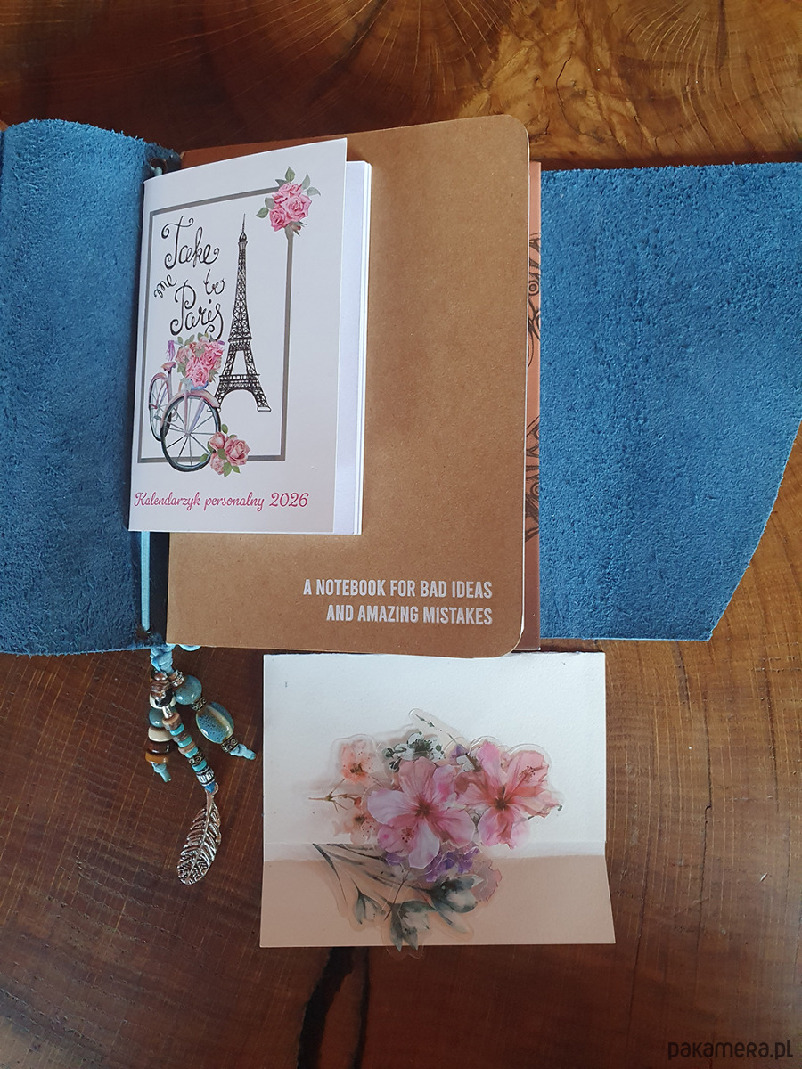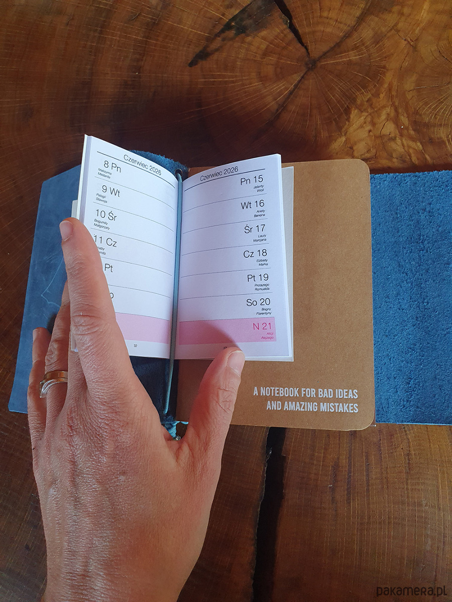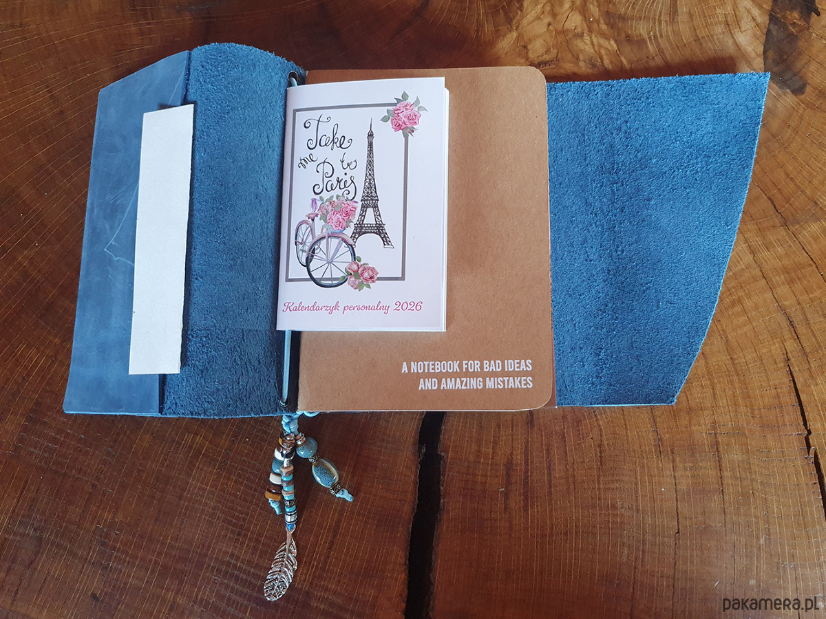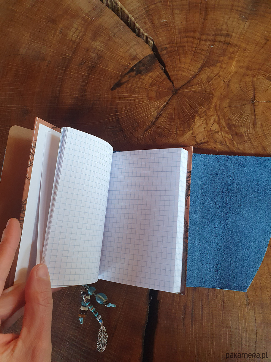 skórzane etui w formacie A5 do którego możesz włożyć dowolne notatniki. W tym włożone są dwa notesy: z kartkami w kratkę i czystymi, oraz kieszonkowy kalendarzyk.