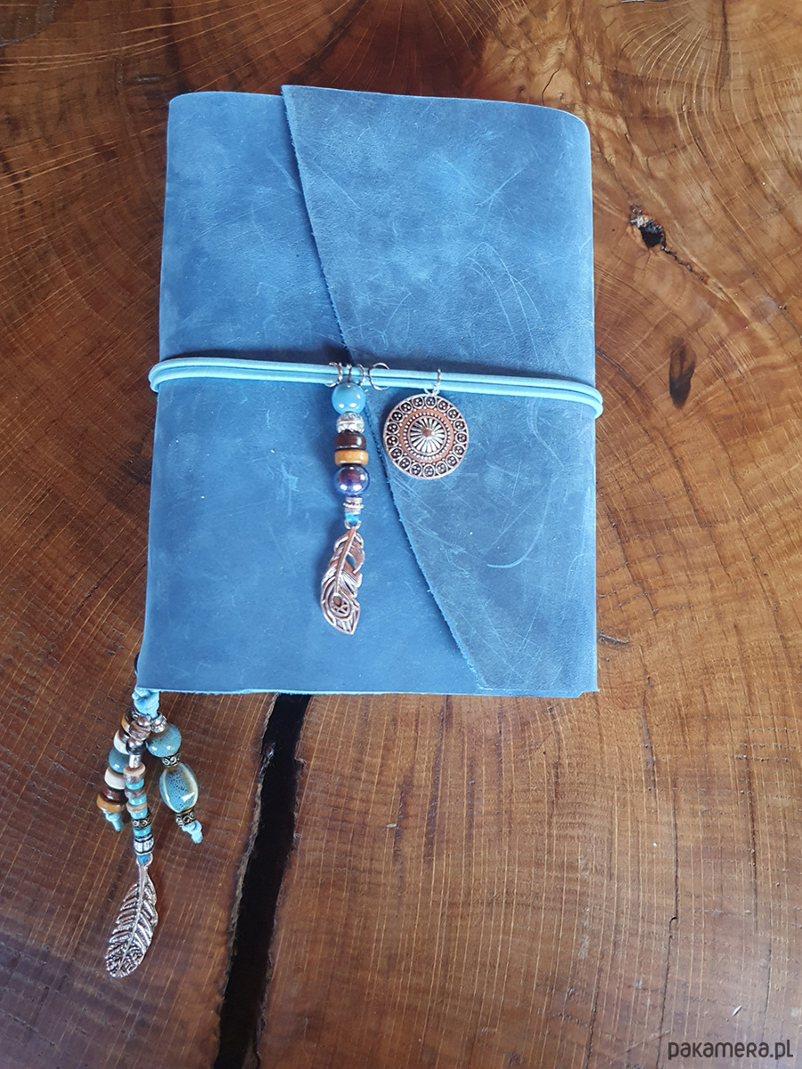 Niedoskonałości widoczne na skórze i zawieszki wykonane z koralików ceramicznych, drewnianych i metalowych, nadają notesikowi naturalnego uroku.