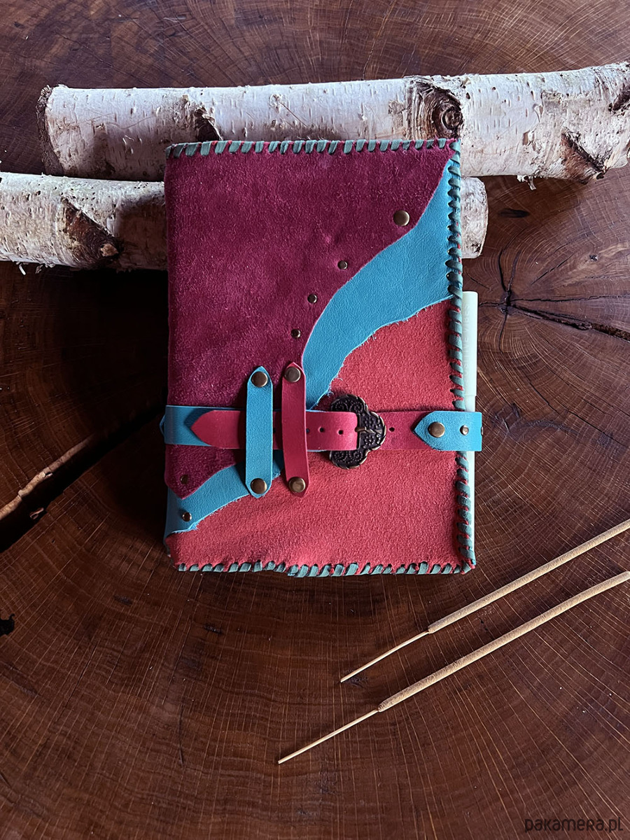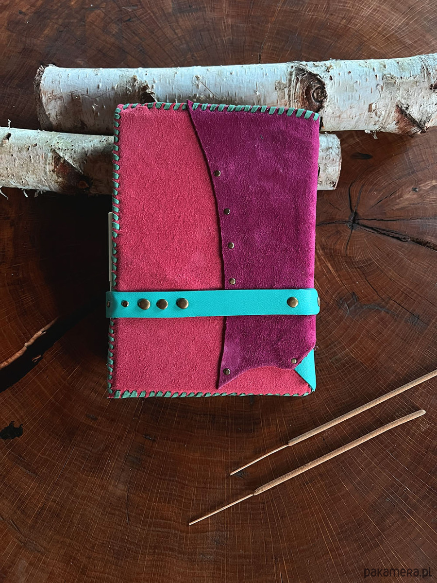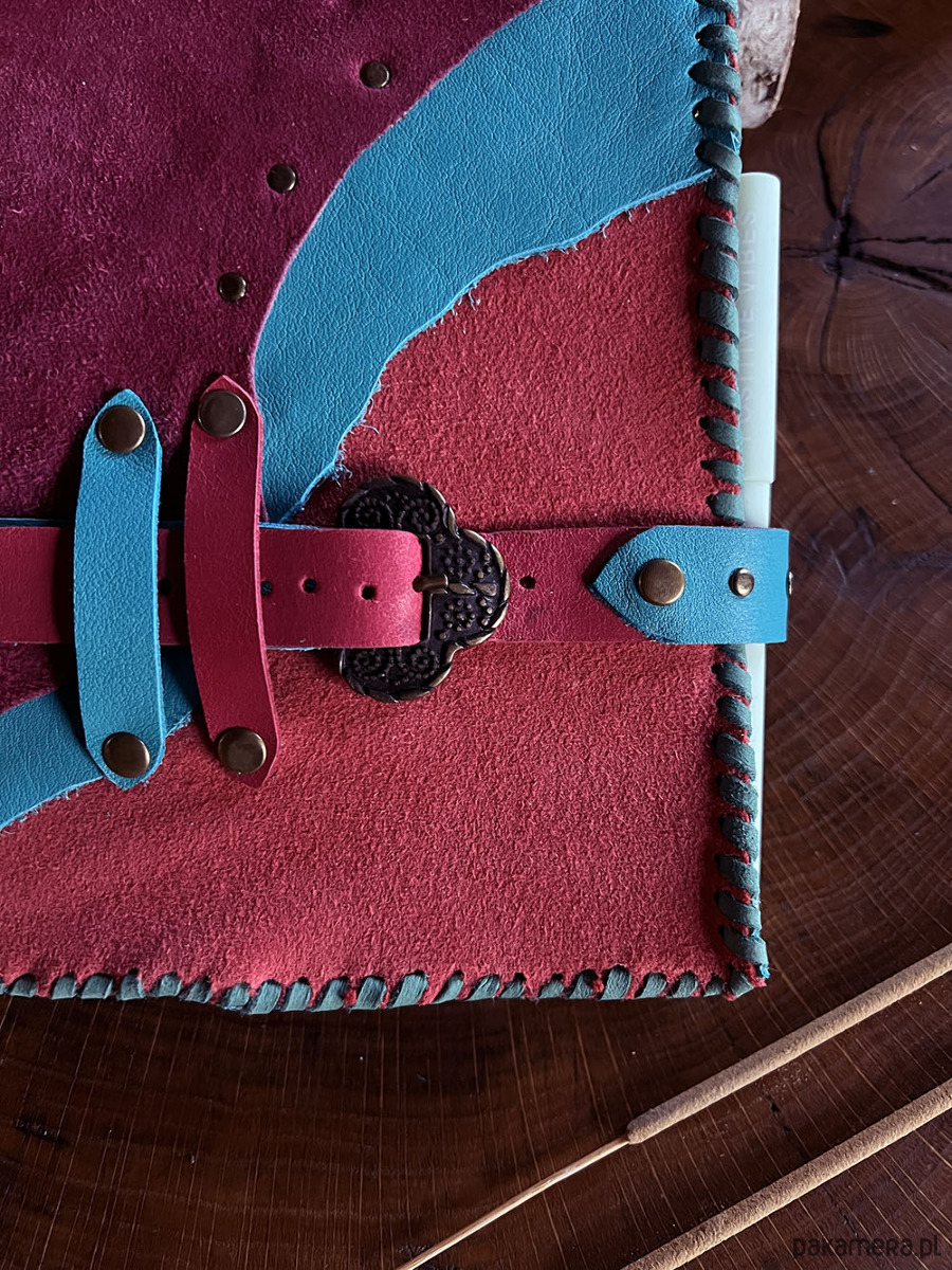 Niedoskonałości widoczne na skórze i szycie rzemieniem, nadają notesowi naturalnego uroku i oryginalności.