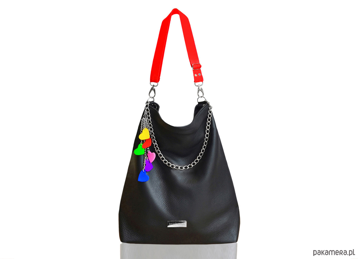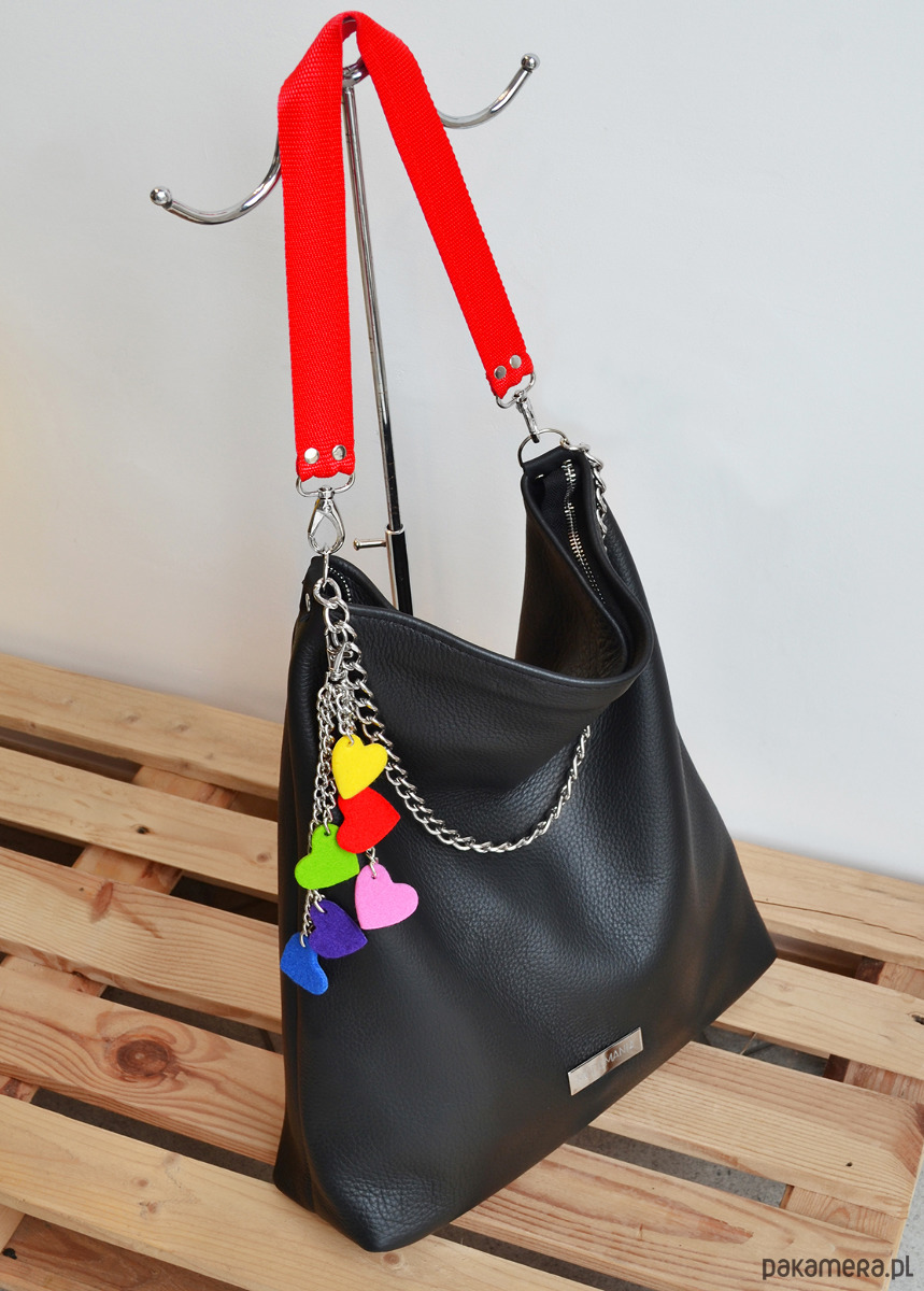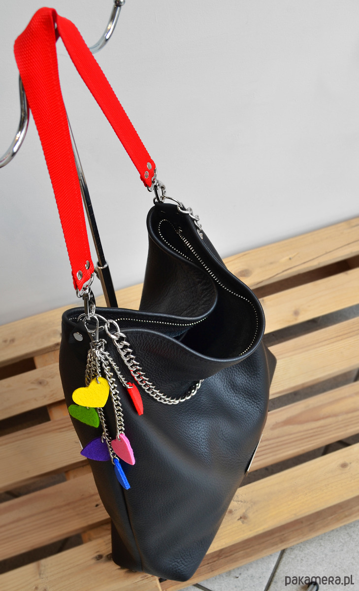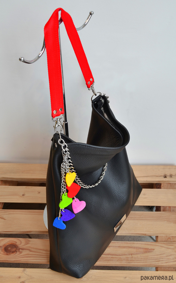 Rączki to regulowany czerwony pasek parciany. Torba może być noszona na jedno ramię lub na skos.