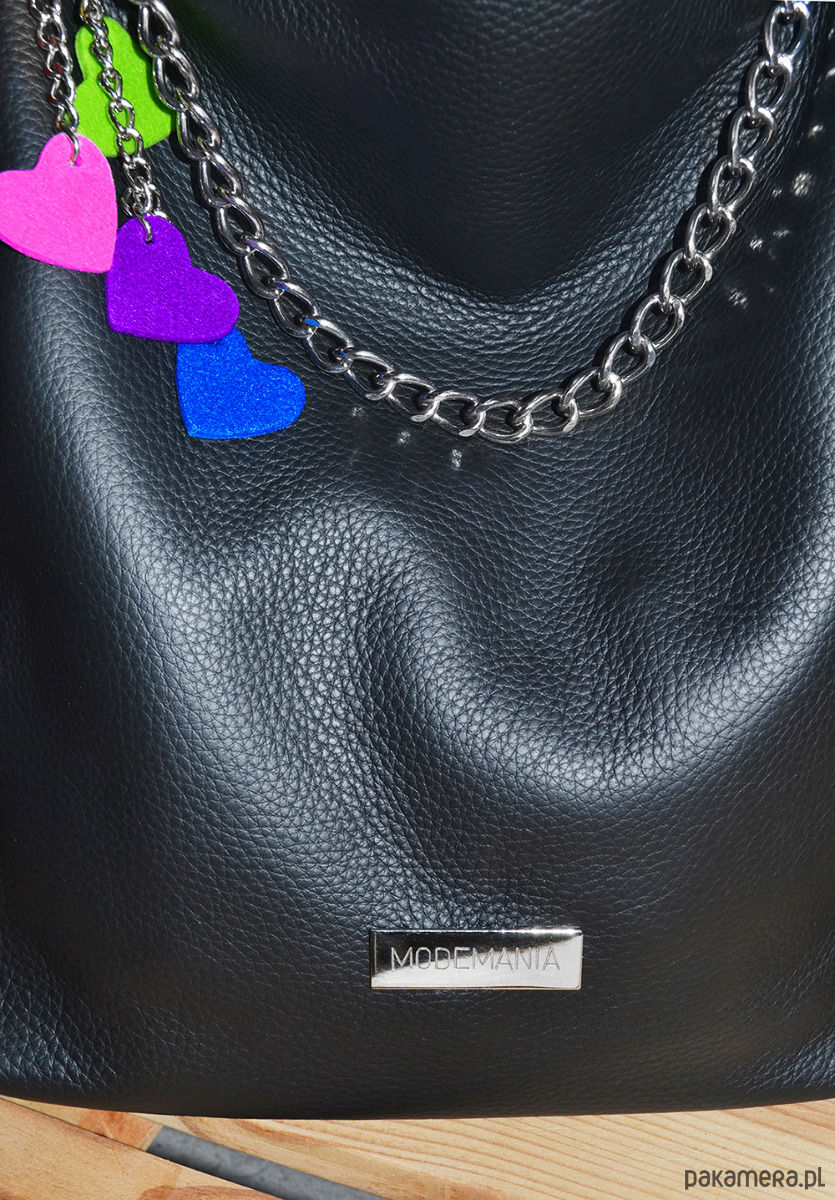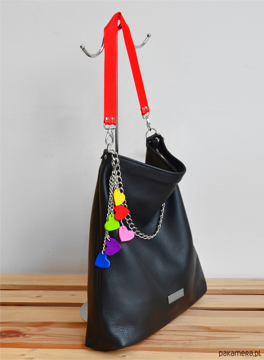 Breloczek złożony z kolorowych serduszek na łańcuszku, może być przepinany do innych torebek lub kluczy.