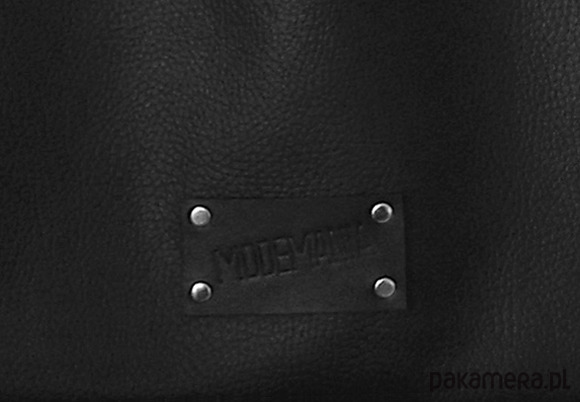 Na froncie metalowy łańcuch i skórzana metka przybita nitami.