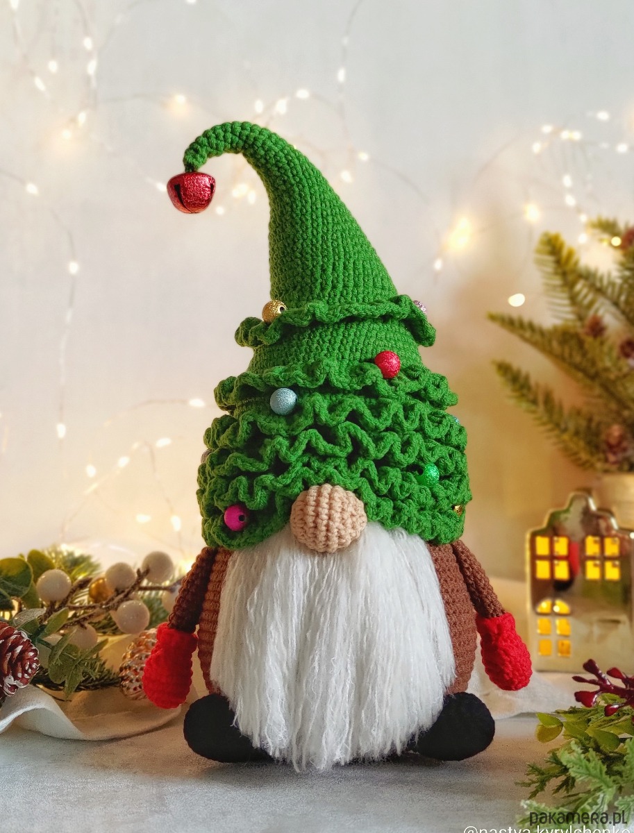 - Czapka gnoma ma kształt choinki, ozdobiona jest kolorowymi, błyszczącymi koralikami, a na końcu kapelusza wisi metalowy dzwoneczek (kolor losowy).