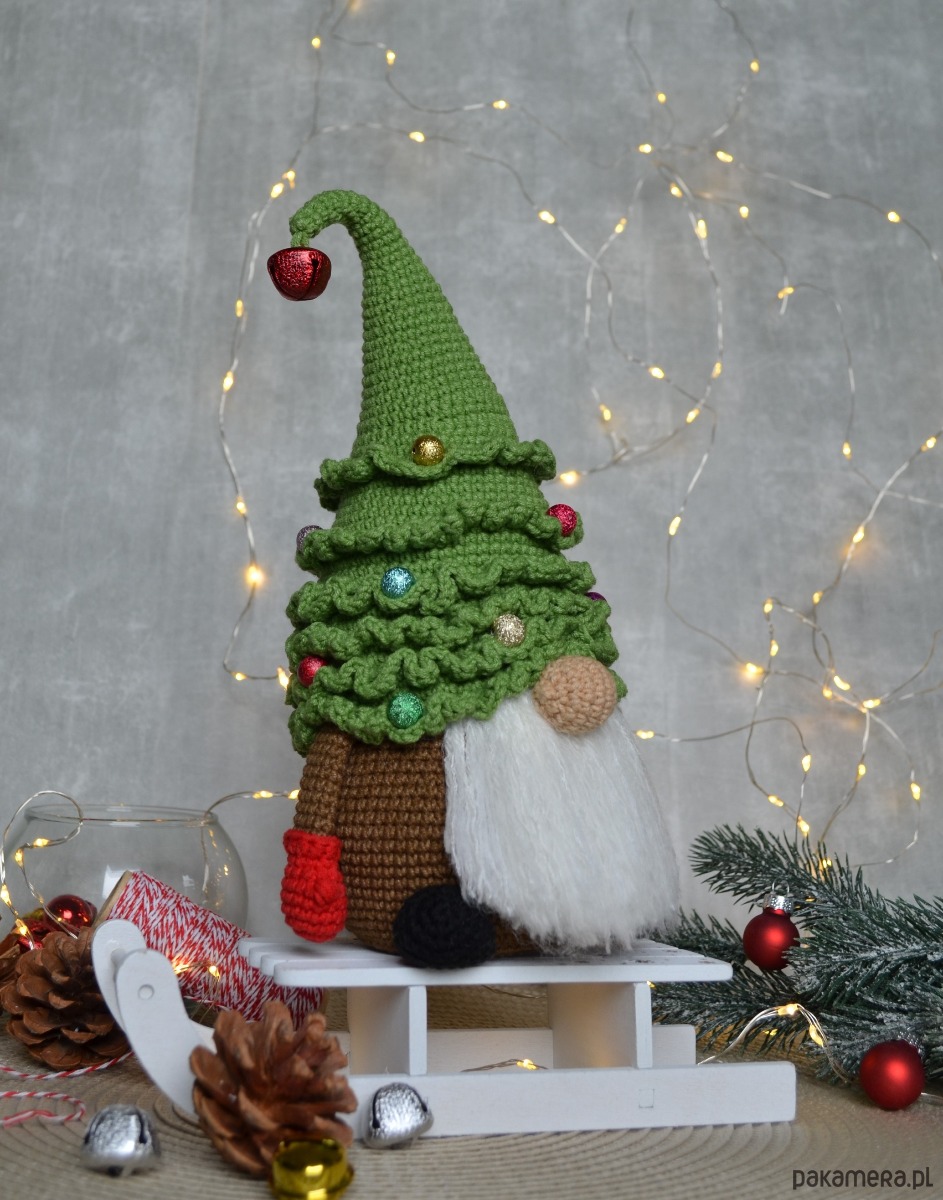 - Czapka gnoma ma kształt choinki, ozdobiona jest kolorowymi, błyszczącymi koralikami, a na końcu kapelusza wisi metalowy dzwoneczek (kolor losowy).