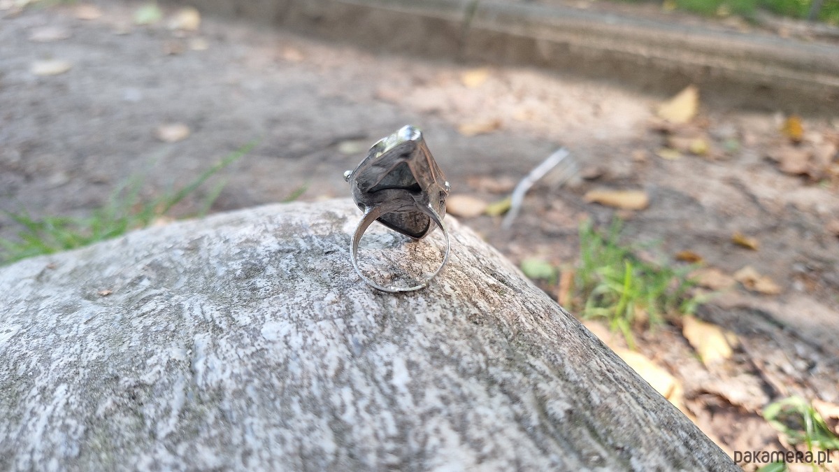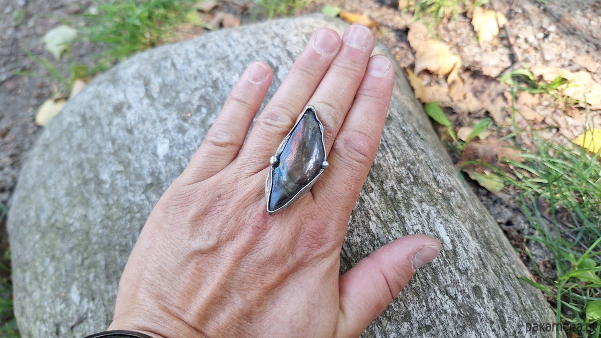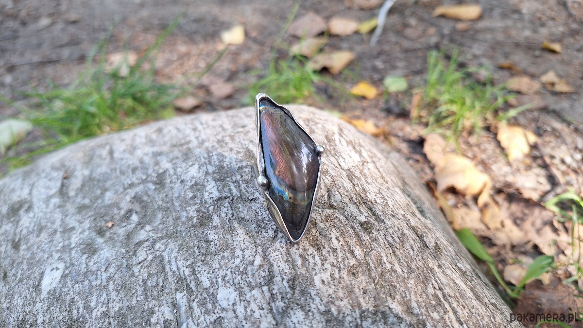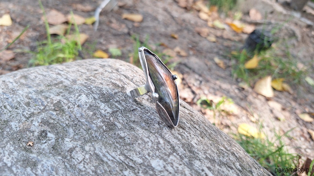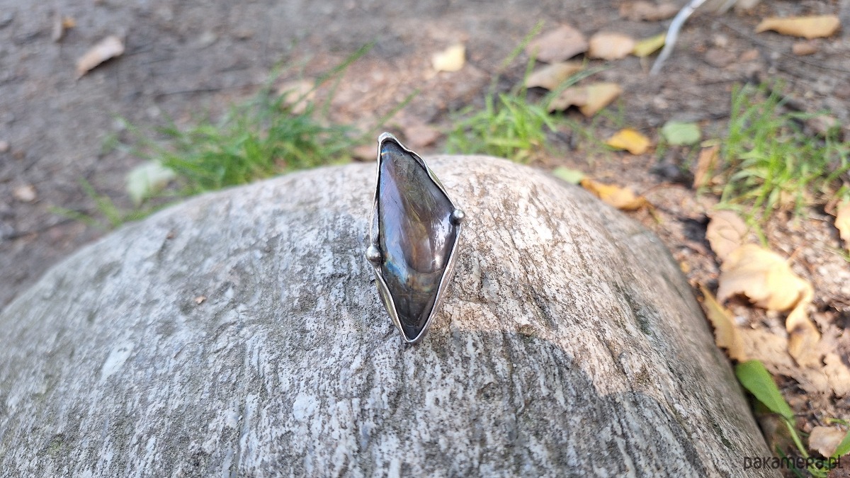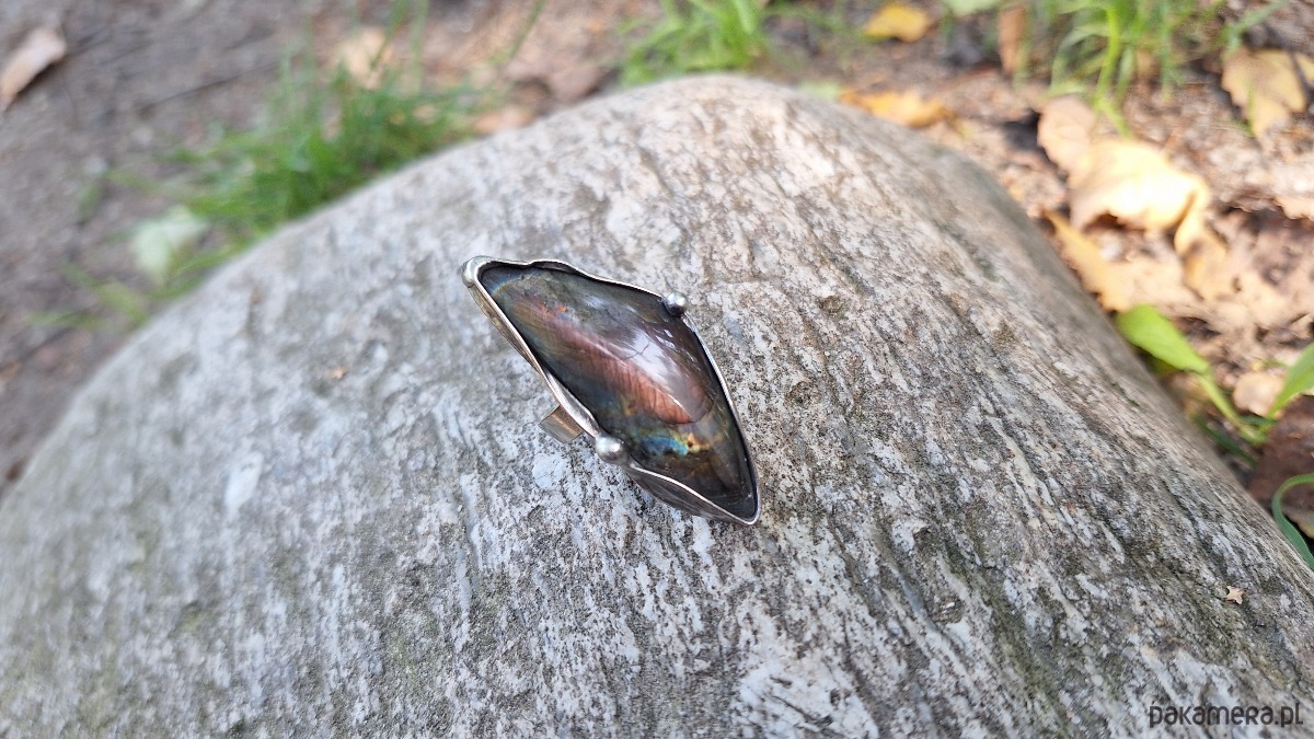 Pierścionek wykonany z miedzi, cyny i labradorytu. Wymiary ok. 4.5 na 2 cm. Regulowany. Nie jest ciężki.