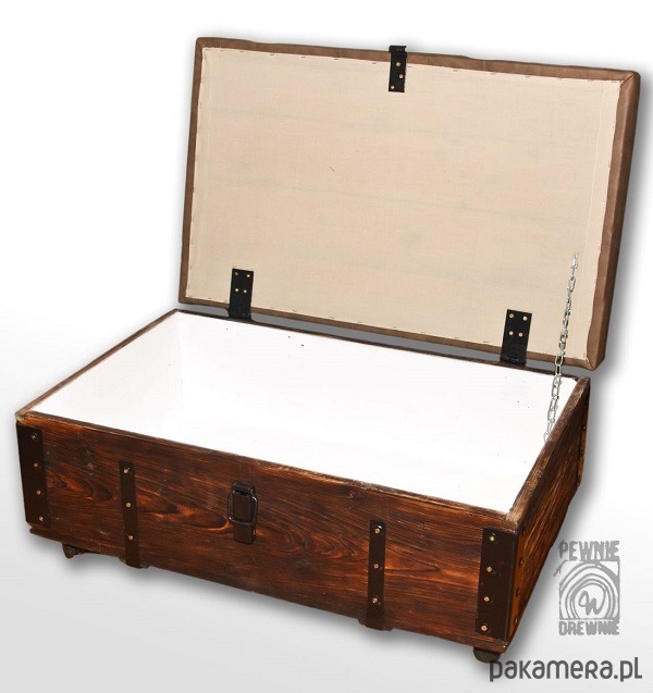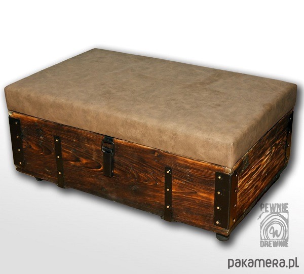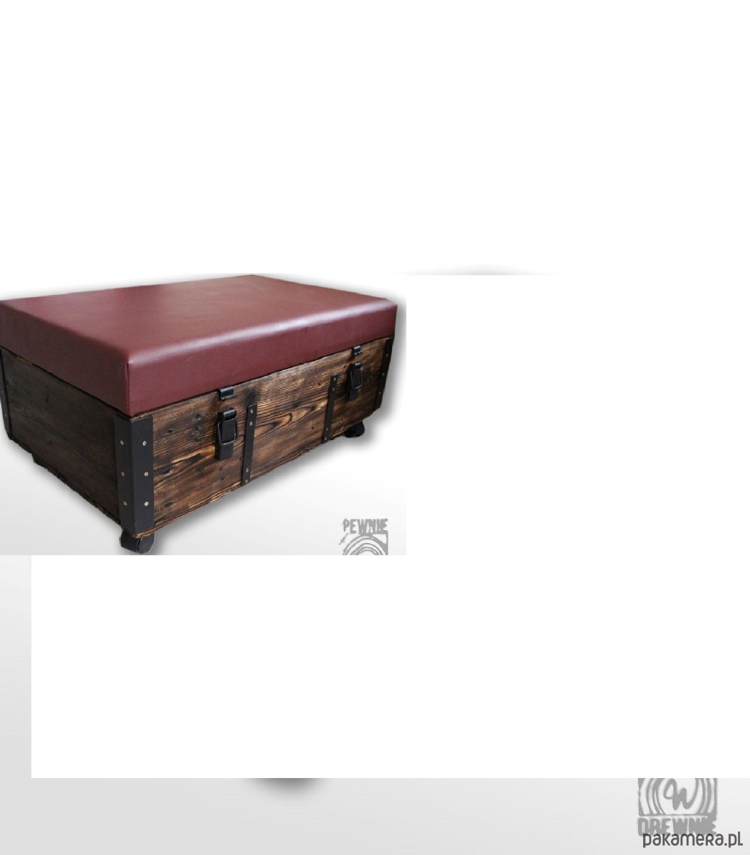 Niepowtarzalna skrzynia/kufer z tapicerowanym siedziskiem. Wyposażona w funkcjonalne kółka. Zastosowane przetarcia i postarzenia uwydatniły niepowtarzalną fakturę i rysunek drewna. Siedzisko staranie wykonane pokryte eko-skórą - pięknym i ciekawym a zarazem praktycznym materiałem. Skrzynia ta to nie tylko miejsce do siedzenia i przechowywania różności ale przede wszystkim wyszukana i nietypowa dekoracja sypialni, salonu ale także biura czy hotelowego pokoiku. Wykonana w całości ręcznie. Wykończona i zakonserwowana wyłącznie ekologicznymi środkami do drewna bezpiecznymi dla dzieci i alergików. Możliwość zamówienia innych kolorów i wymiarów oraz zmiany opcji wykończenia (tj. tkanina obiciowa)
