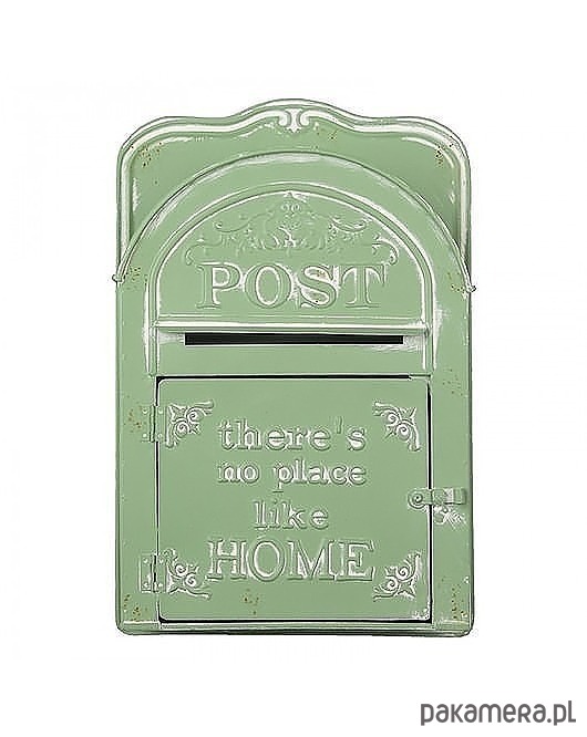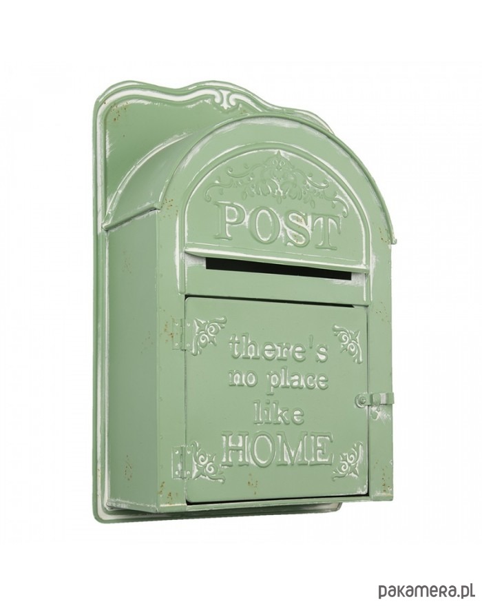 Skrzynka na listy w starym stylu. Wykonana z metalu. Celowo mocno postarzana. Na przodzie tłoczenia.