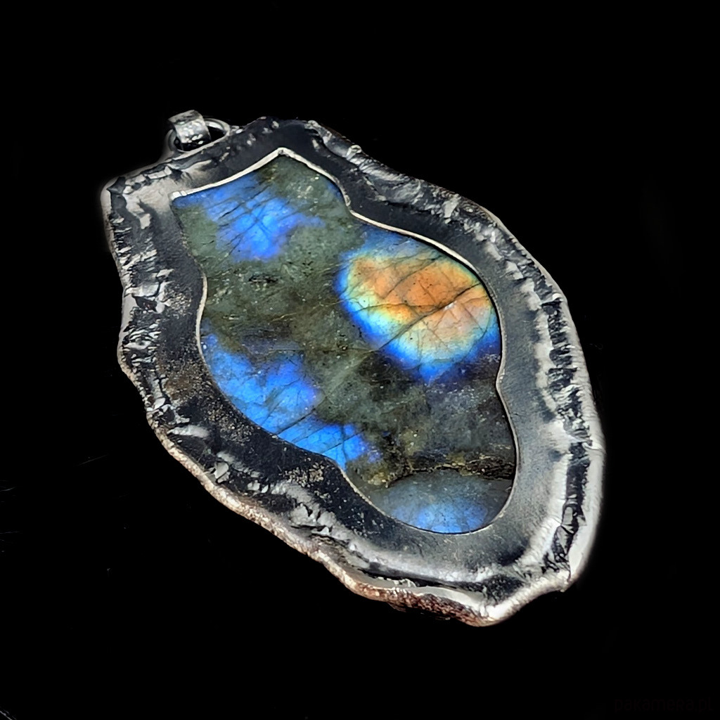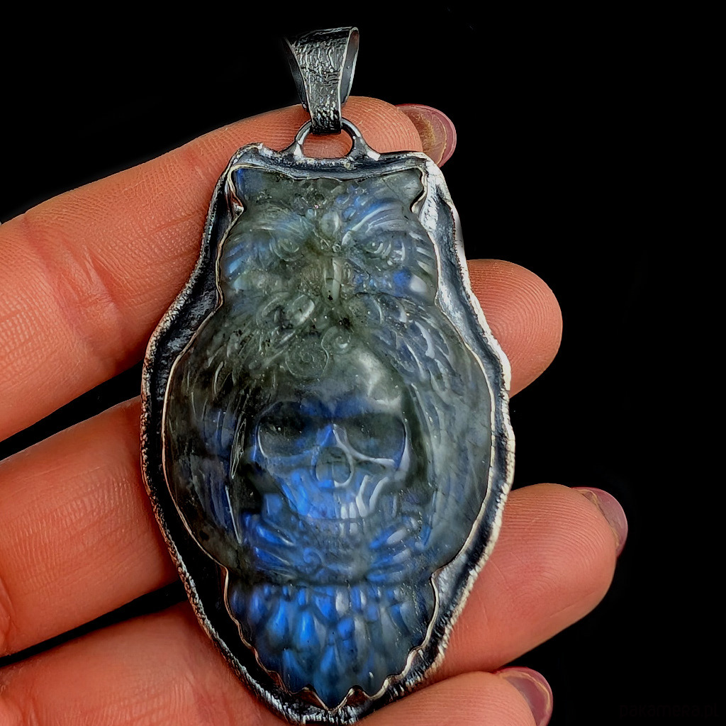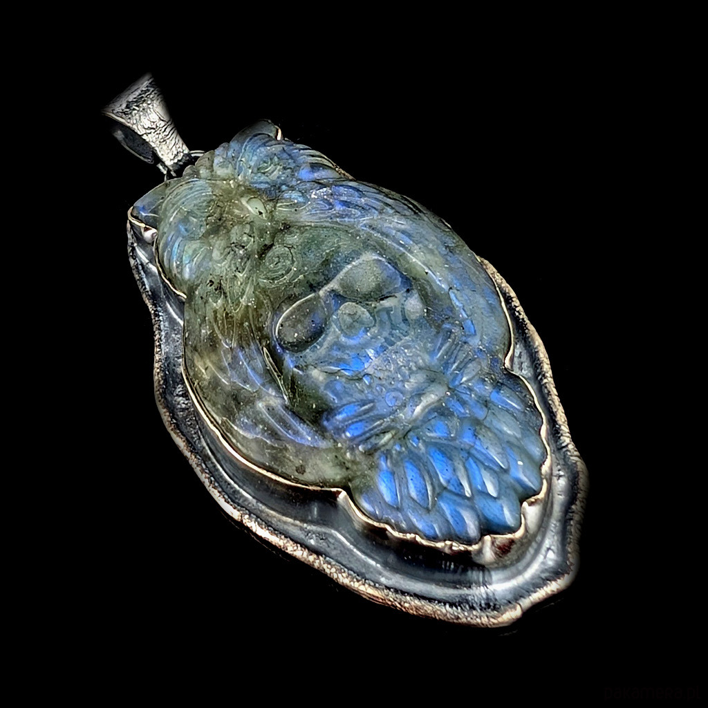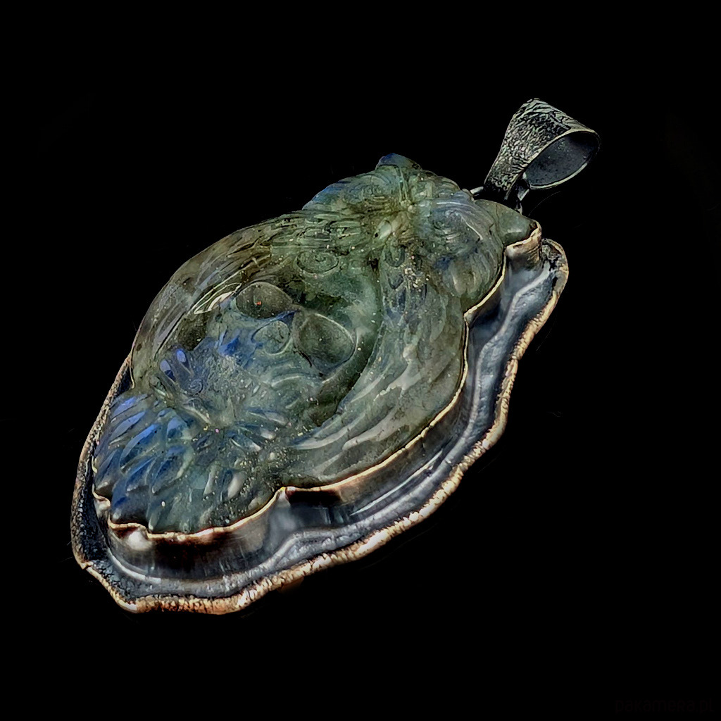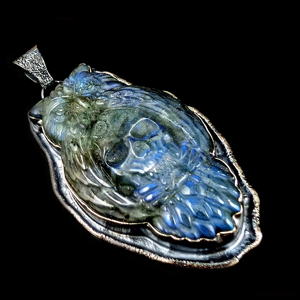 Bardzo okazały wisior z oksydowanego srebra próby 925 z oprawionym rzeźbionym w labradorycie wizerunkiem sowy i czaszki. Piękne detale. Unikat. Wymiary 60 x 40 mm, długość72 mm. Waga 43 gramy. Zapakowany w ozdobne pudełeczko.