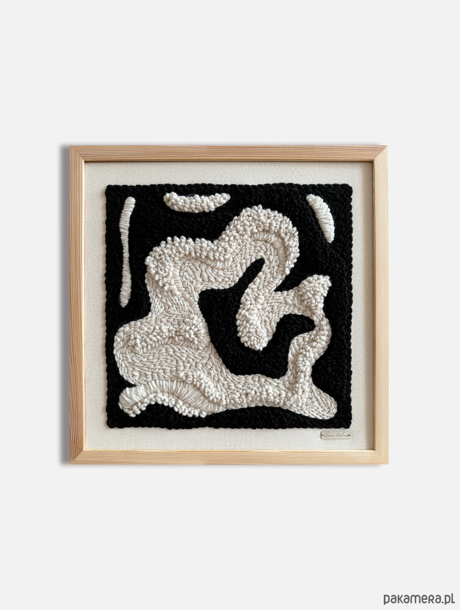 Ten ręcznie wykonany obraz o wymiarach 40×40 cm to harmonijne połączenie dwóch kontrastujących kolorów, które tworzą ciekawą, organiczną formę. Oprawiony w naturalną ramę sosnową, doskonale wkomponuje się w każde wnętrze, nadając mu nowoczesny i stylowy charakter.