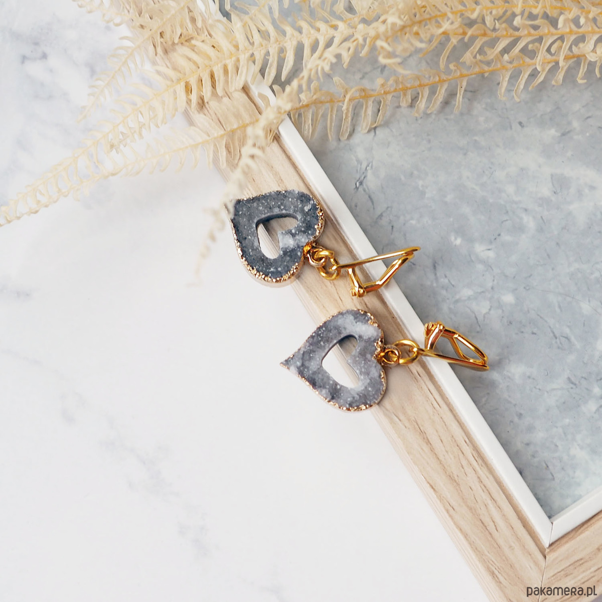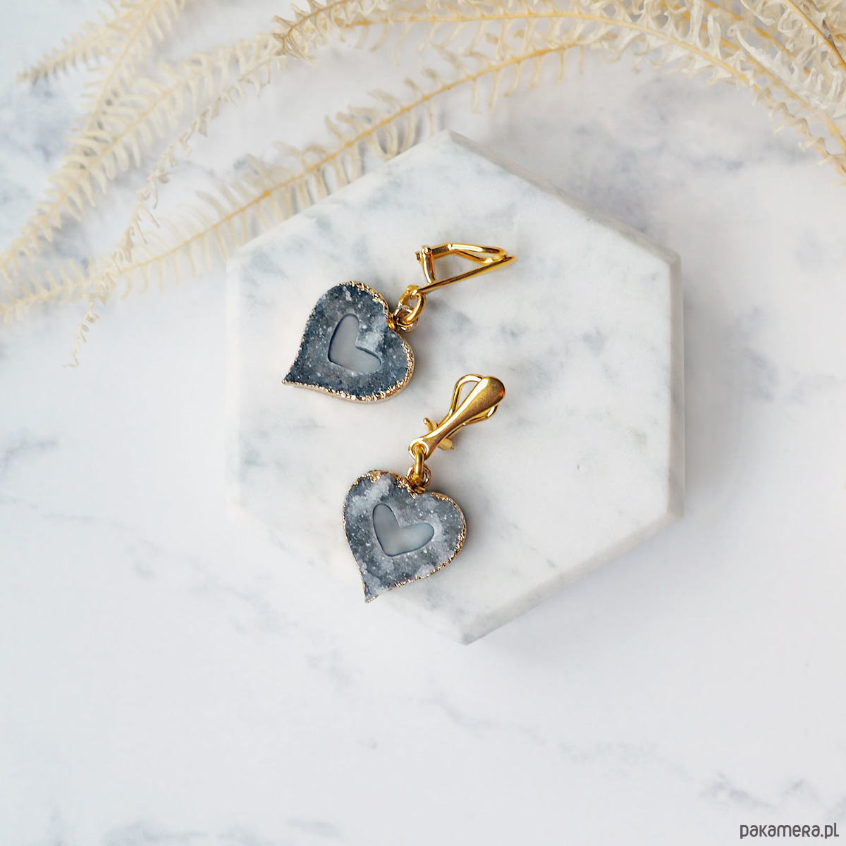 ŚLICZNE KLIPSY WISZĄCE srebro pozłacane i serca druzy