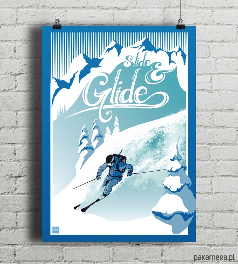 Plakat w stylu vintage z autorską grafiką inspirowaną narciarstwem alpejskim. Przedstawia narciarza zjeżdżającego po ośnieżonym stoku górskim oraz napis "Slide - Glide".