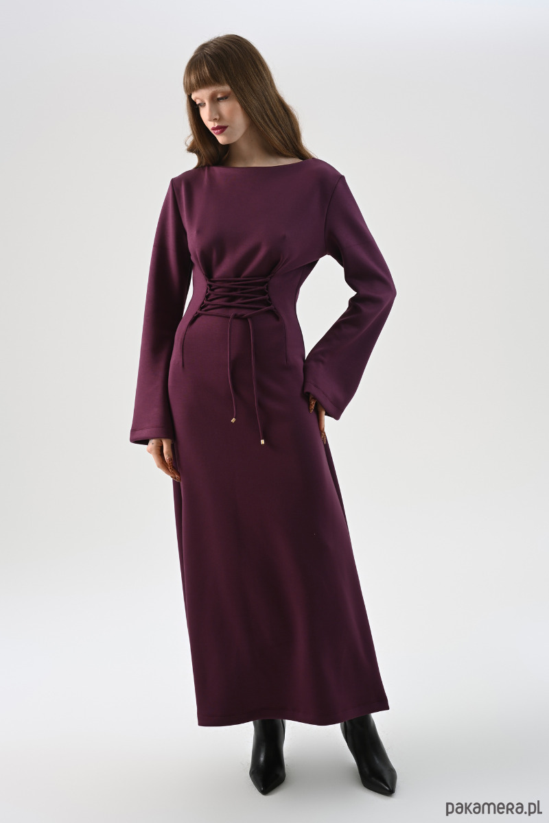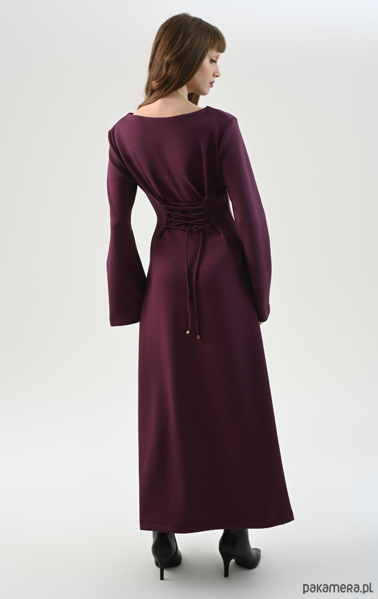 Śliwkowa Sukienka Maxi z Wiązaniem Gorsetowym