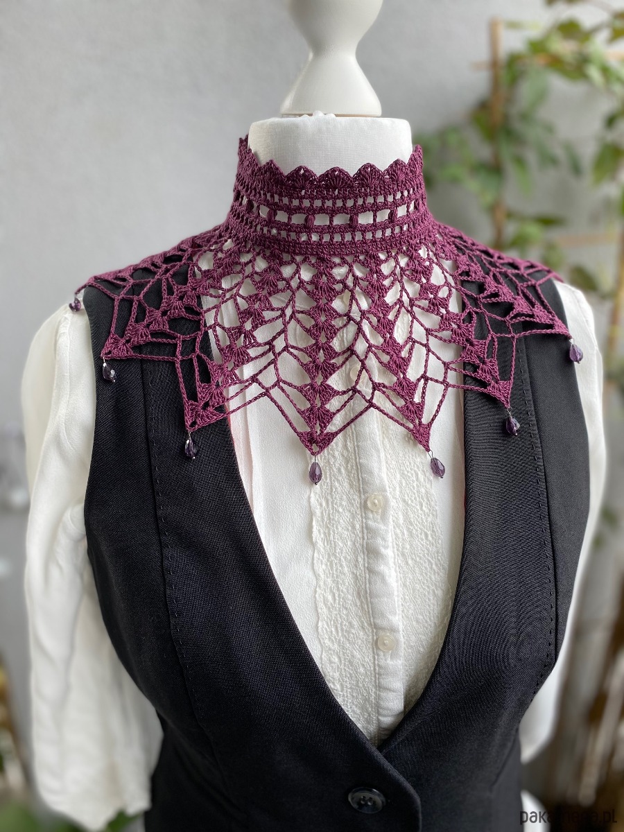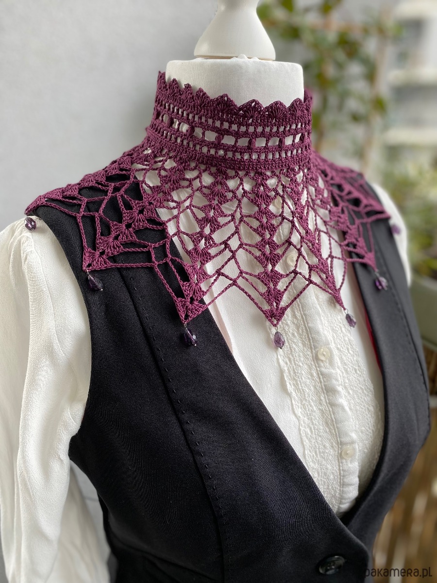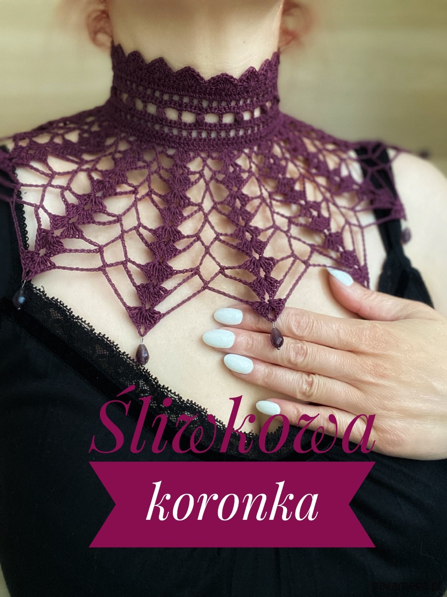 Śliwkowy koronkowy naszyjnik utkany na szydełku