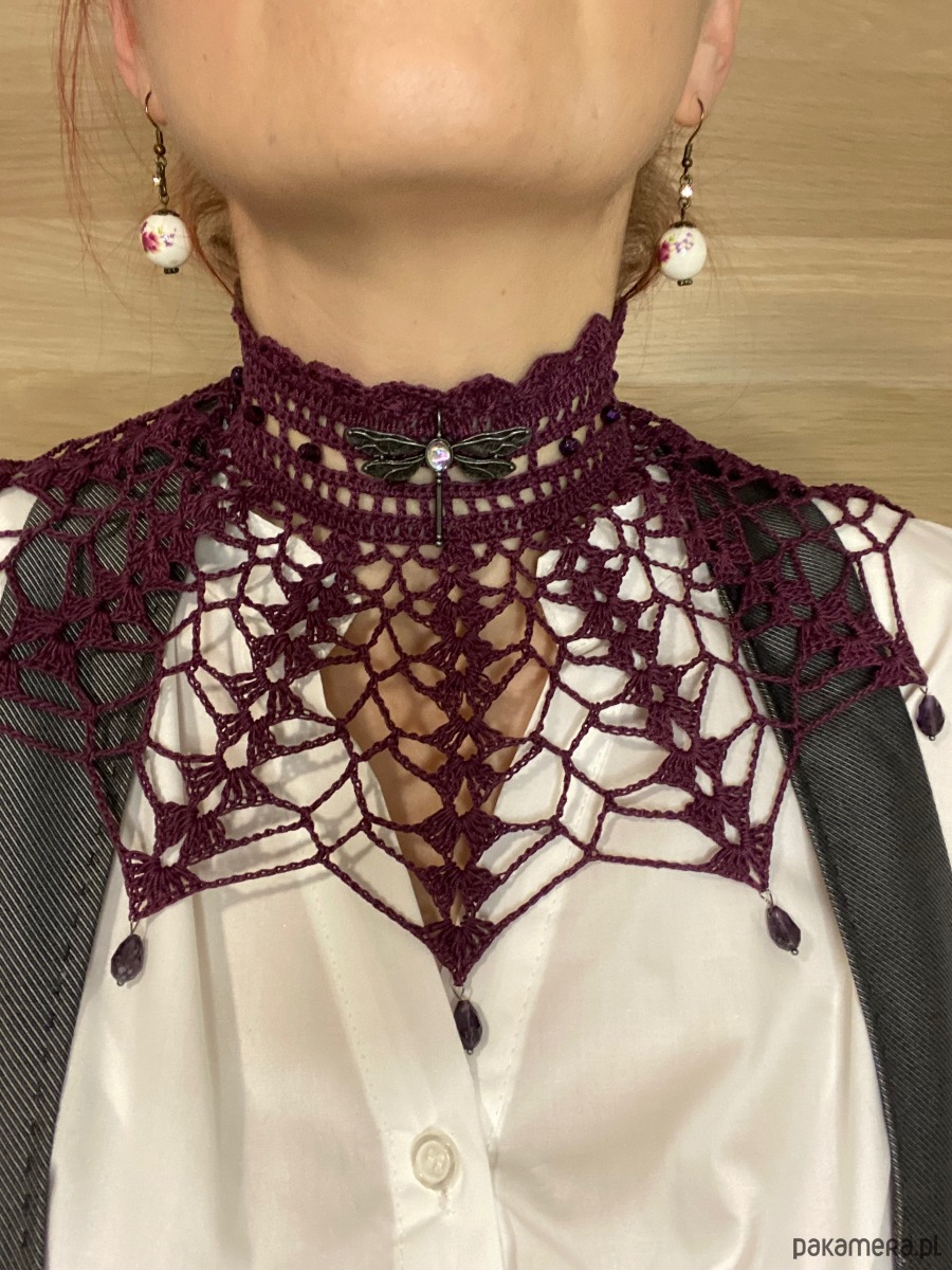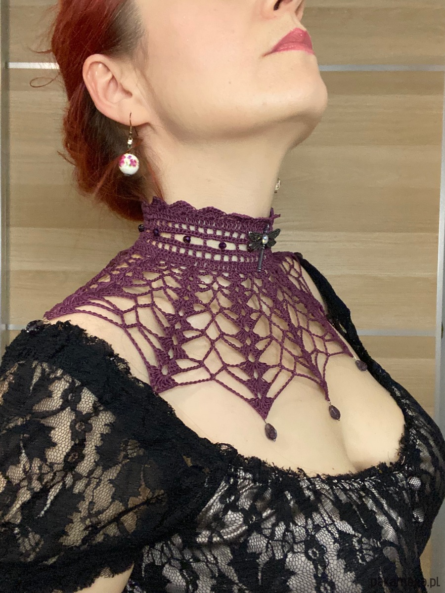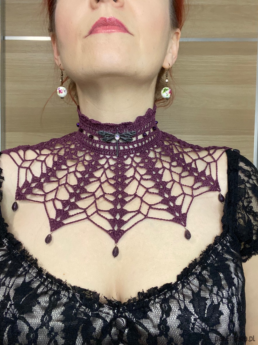Co tu dużo mówić… jest prześliczna, duża koronkowa śliwkowa kolia niczym ważka na pajęczynie, jest piękna! ✨💜ozdobiona fioletowymi koraliczkami fasetowanymi oraz fioletowymi łezkami na końcach koronki, ważka jest wisienką na torcie❗️