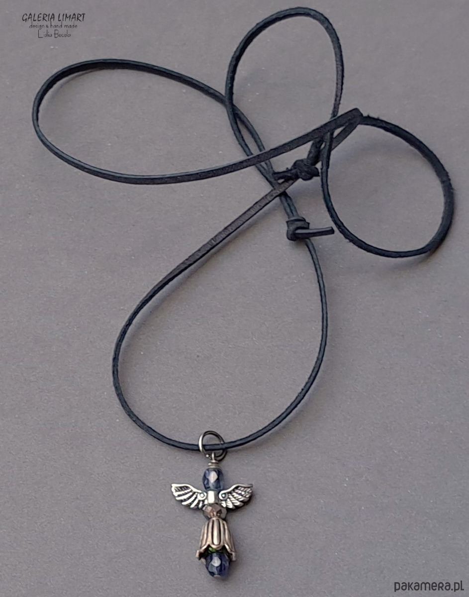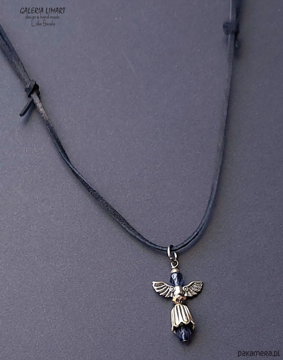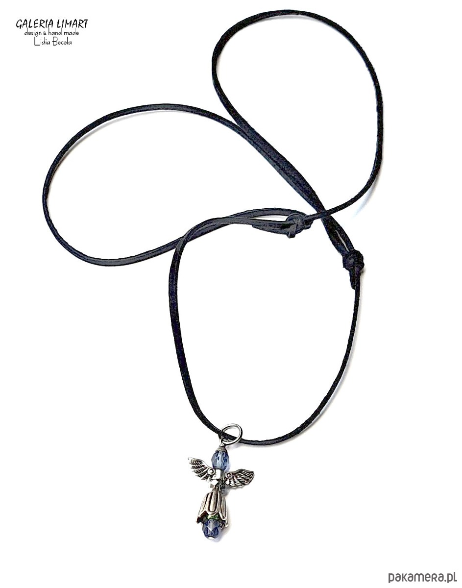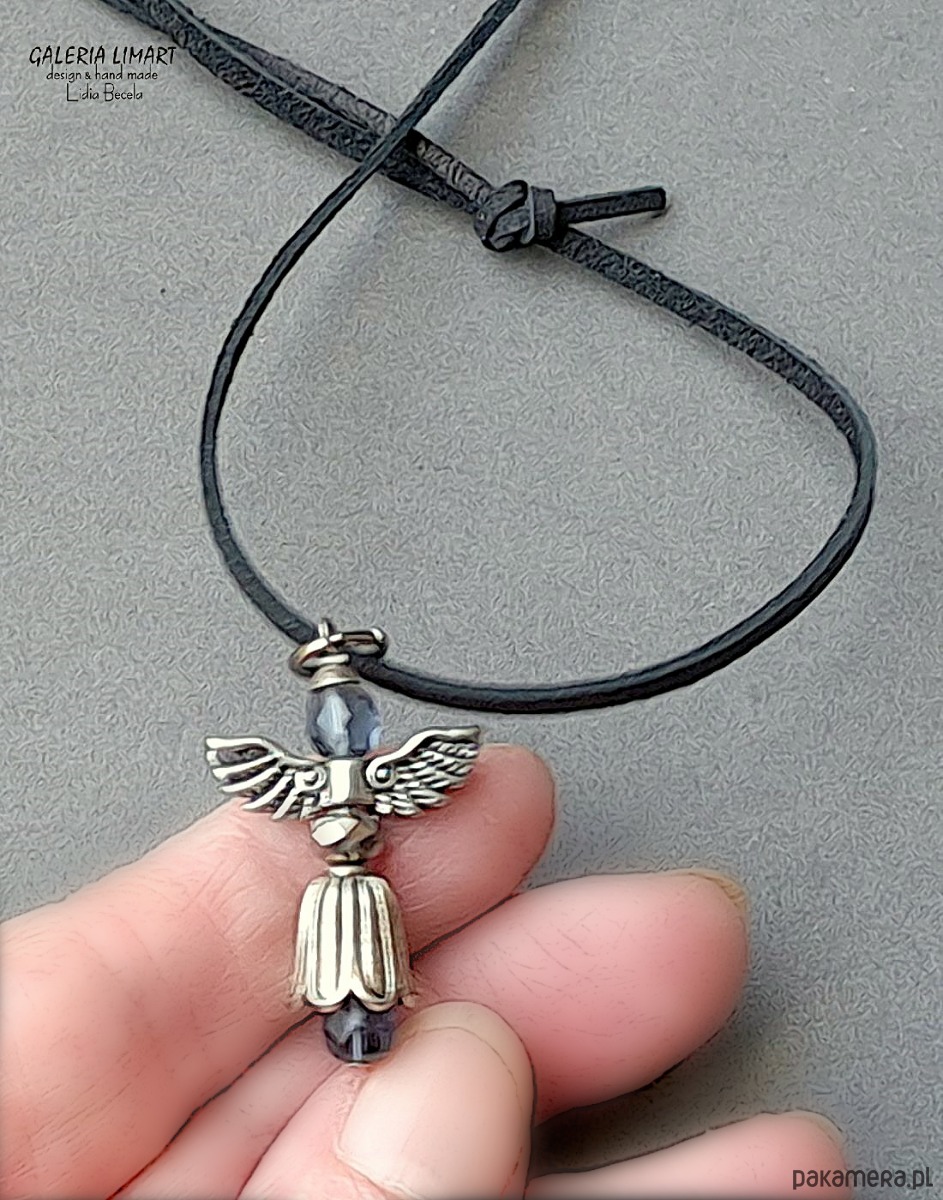 Jest to po prostu fantastyczny, uroczy upominek na każdą okazję, w sam raz dla delikatnej i subtelnej osoby. Dł. aniołka ok. 3,5 cm. Zawieszony na skórzanym czarnym rzemyku specjalnie zawiązanym tak by łatwo można było regulować długość (GRATIS).