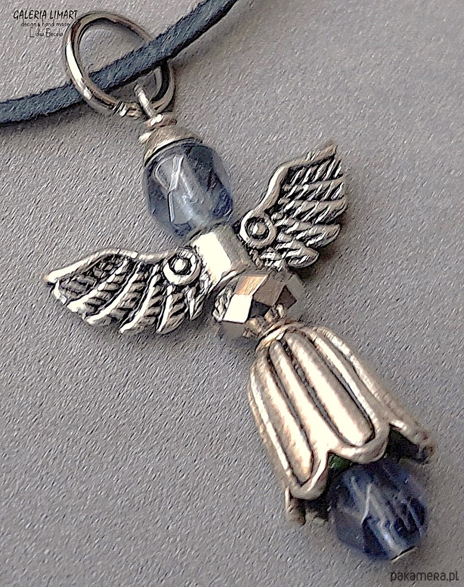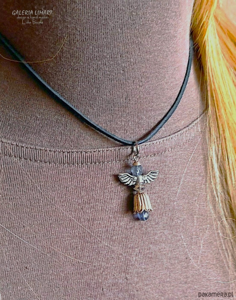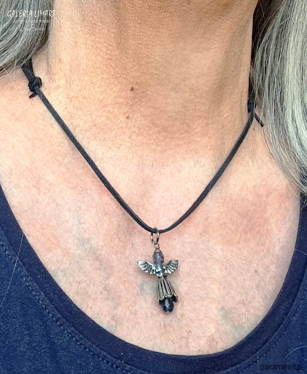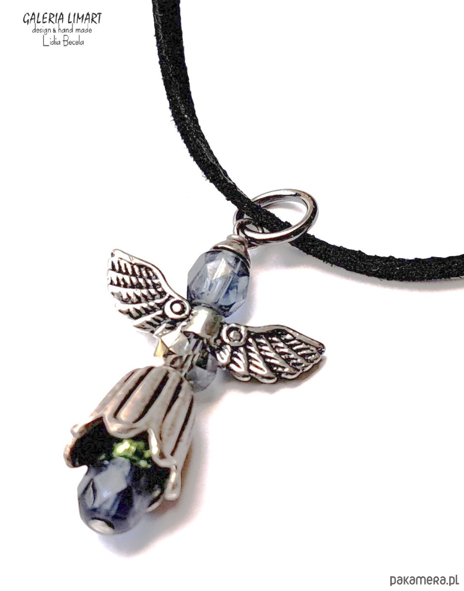 Jest to po prostu fantastyczny, uroczy upominek na każdą okazję, w sam raz dla delikatnej i subtelnej osoby. Dł. aniołka ok. 3,5 cm. Zawieszony na skórzanym czarnym rzemyku specjalnie zawiązanym tak by łatwo można było regulować długość (GRATIS).