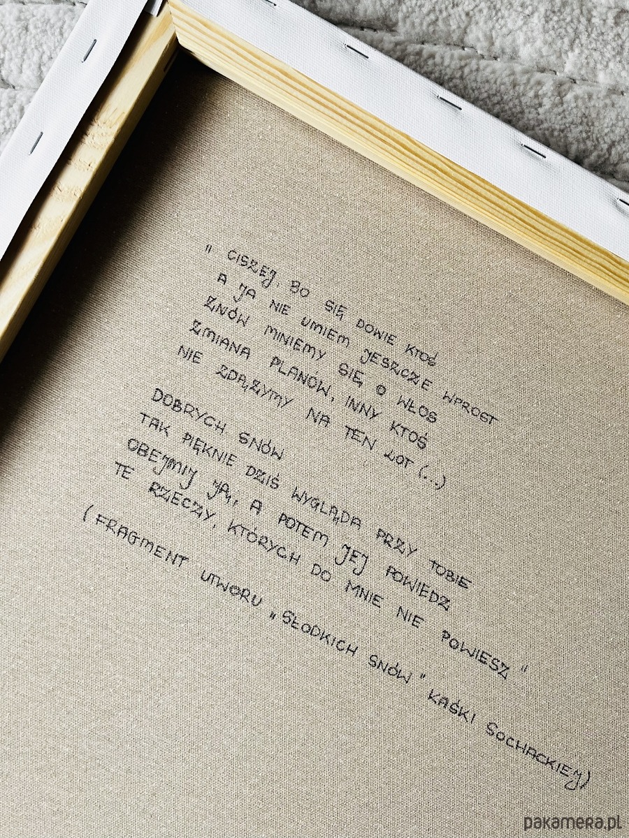 Na rewersie zawarty został fragment utworu "Słodkich snów" Kaśki Sochackiej. Praca pochodzi z cyklu "MADISON. Namalowałam piosenki". Obraz stanowi interpretację utworu Kaśki Sochackiej "Słodkich snów", pochodzącego z płyty "Ta druga'. Za zgodą Autorki kompozycji muzycznej, na rewersie płótna zawarty został fragment malowanej piosenki.
