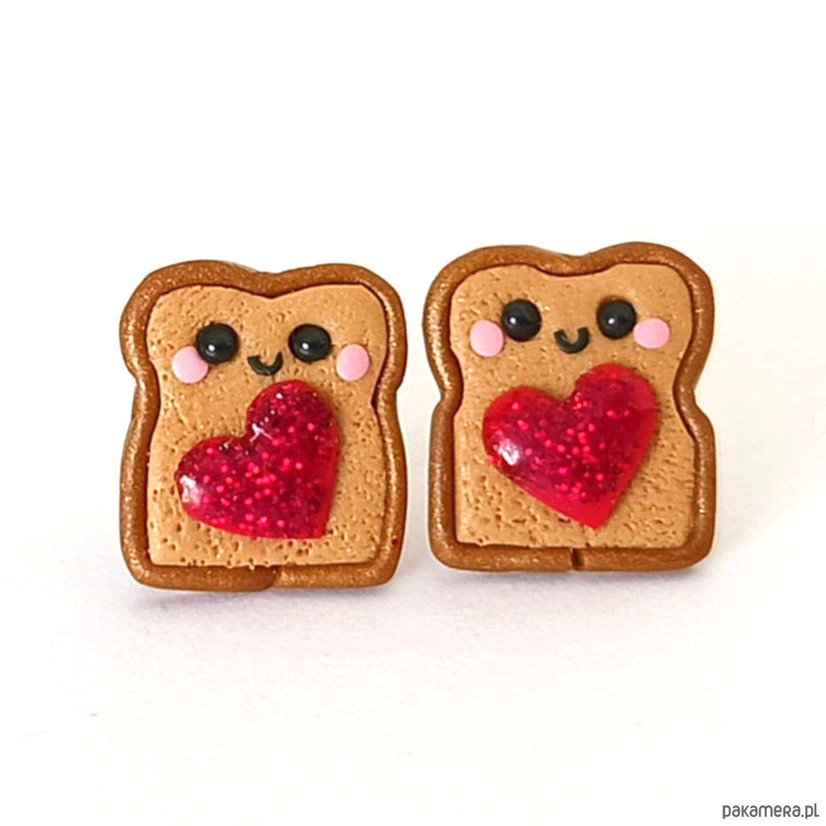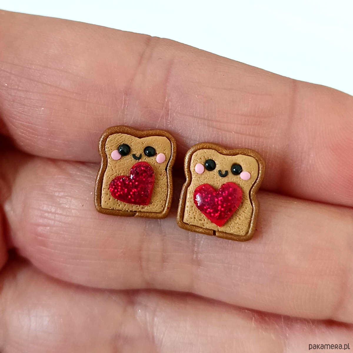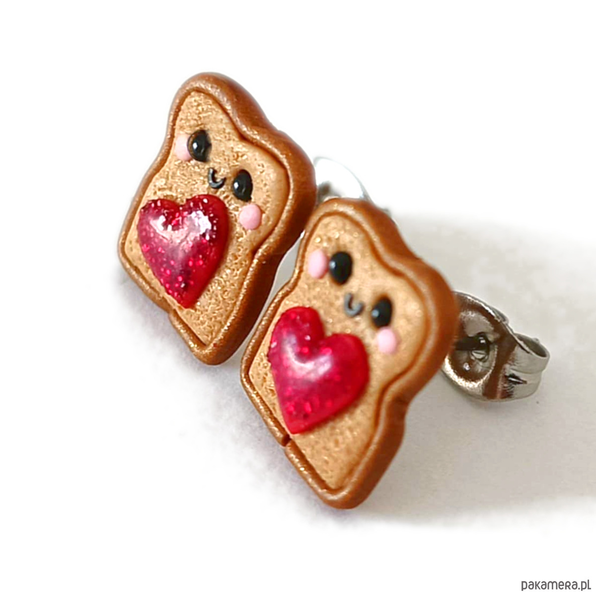 Zabawne kolorowe kolczyki wykonane ręcznie z masy termoutwardzalnej Fimo w kształcie słodkich tostów z dżemem uformowanym w kształt serduszka . Wielkość kolczyków to ok. 12 mm. Sztyfty wykonane są ze stali chirurgicznej.