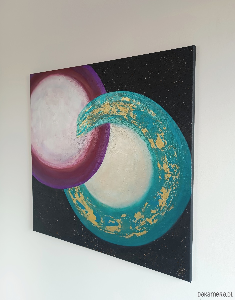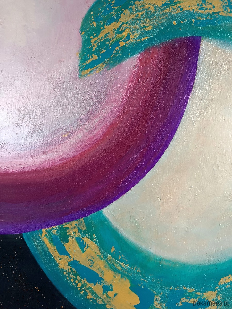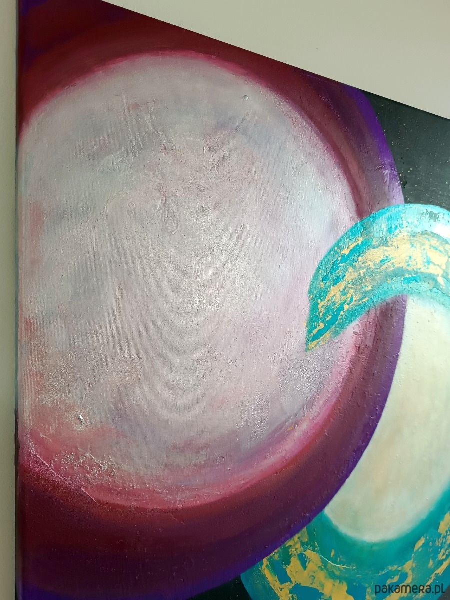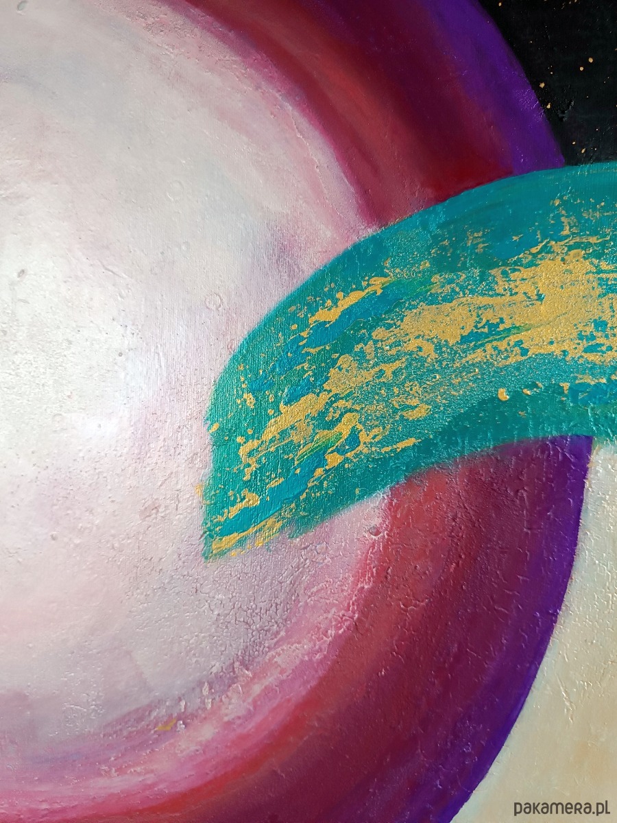 Obraz malowany pastami strukturalnymi i farbami akrylowymi, pięknie odbija światło dzięki metalicznym kolorom. W zależności od kąta jego padania, będzie przybierał mniej lub bardziej intensywne odcienie. Na powierzchni obrazu widać wyraźnie nierówne struktury.