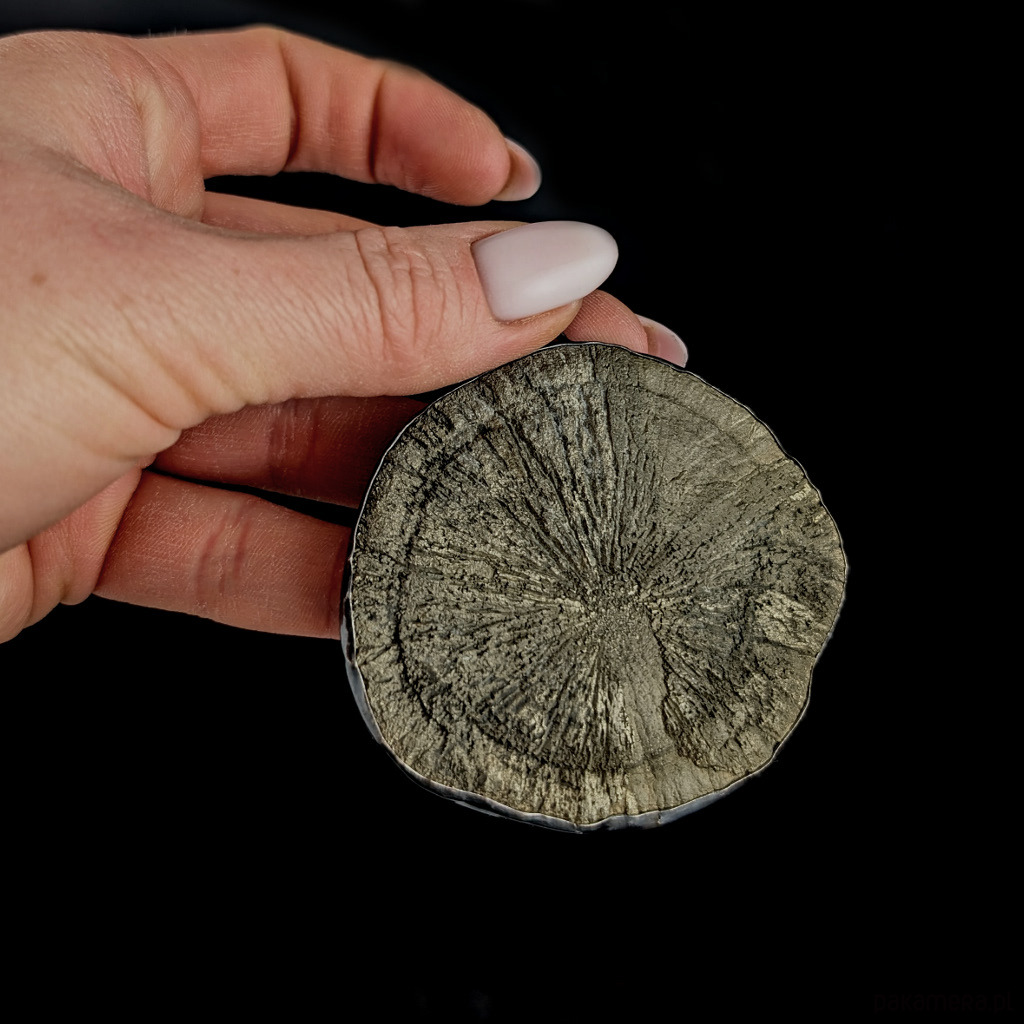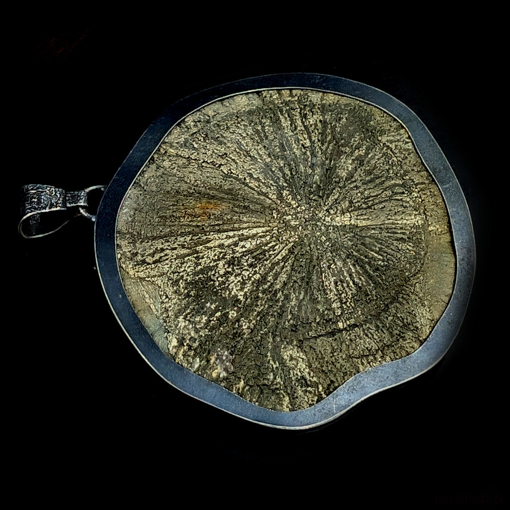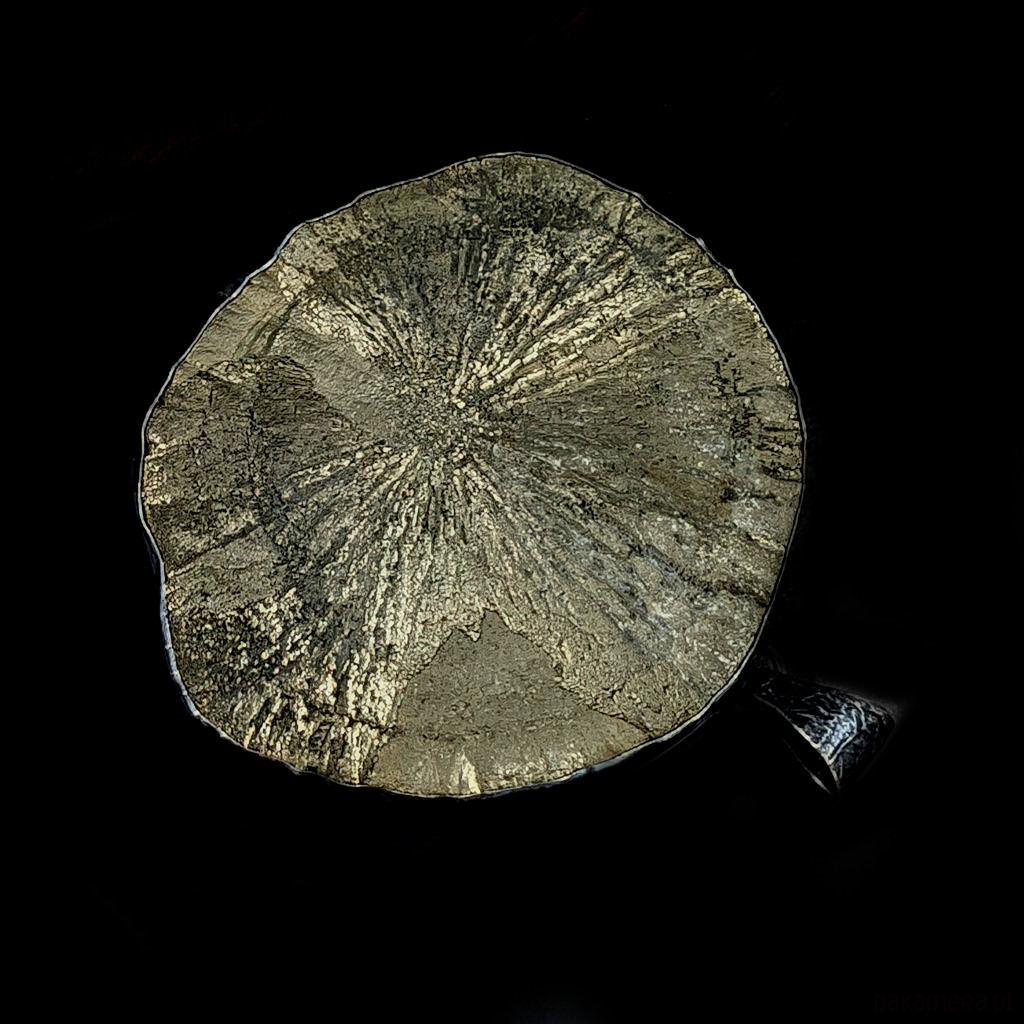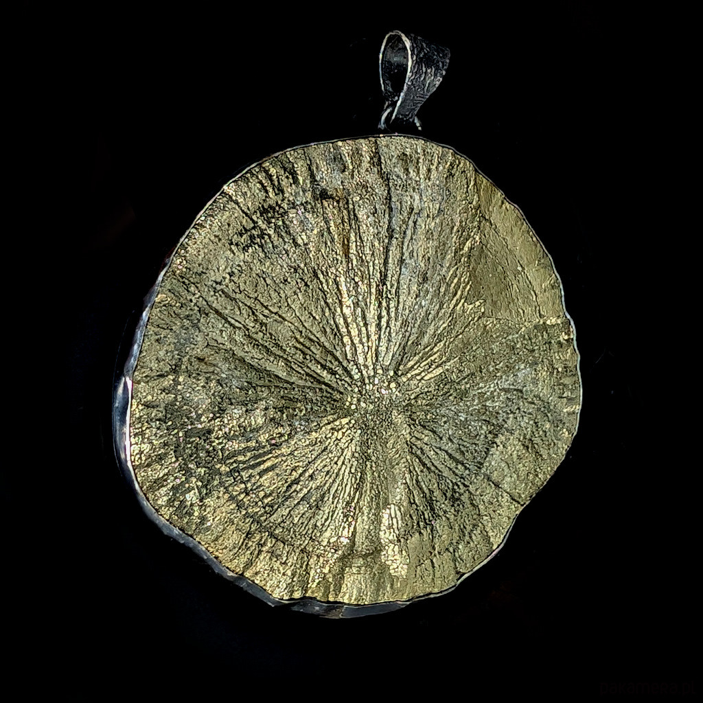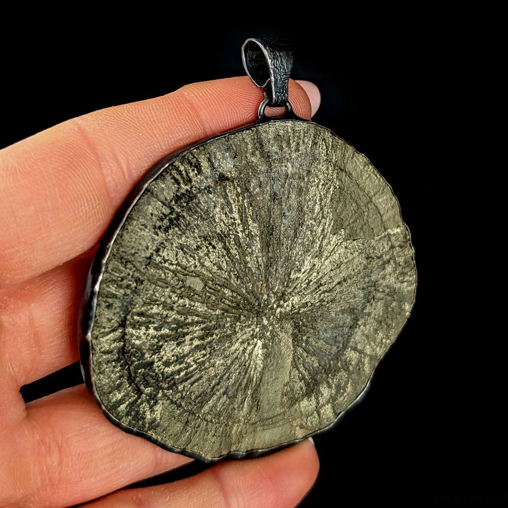 Zjawiskowy wisior z niezwykłym pirytowym słońcem o złotych i zielonkawych refleksach. Okaz jedynie "złapany" w srebrną ramę, która przytrzymuje masywny minerał, nie ujmując jego niepowtarzalnego uroku. Srebro oksydowane. Słońce pirytu to bardzo ceniona w jubilerstwie, iskrząca odmiana słynnego pirytu z USA. Tylko w tym jednym miejscu na Ziemi, w pokładach węgla, piryt tworzy prawdziwe "słońca", zwane również dolarami kopalnianymi. Indianie używali ich do pierwszych wymian handlowych. Lokalizacja: USA - Illinois. Wymiary 68 x 60 mm . Długość max 76 mm. Waga 86 gramów. Zdjęcia nie oddają pięknych odcieni słońca. Tył otwarty. Wisior zostanie zapakowany w ozdobne pudełeczko.