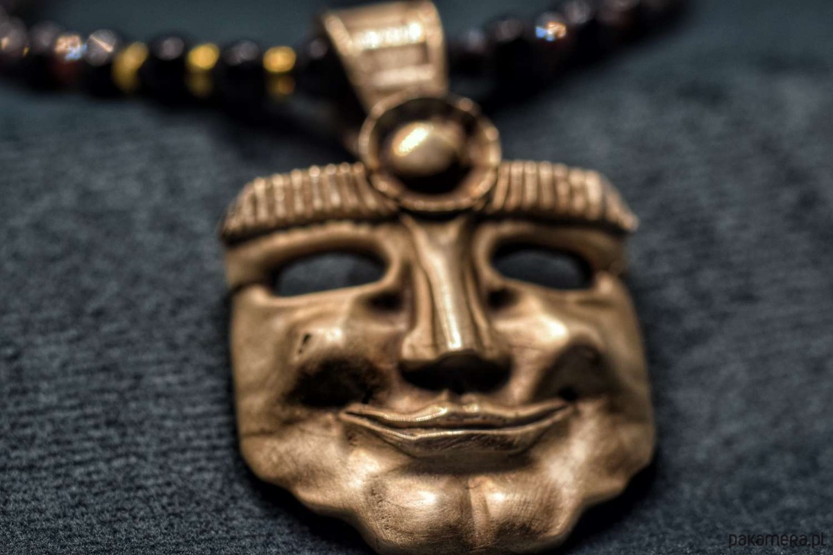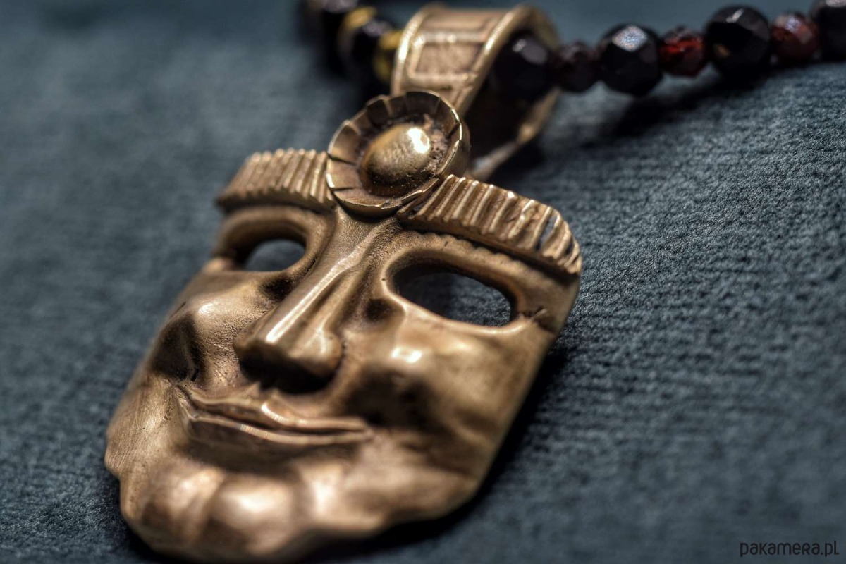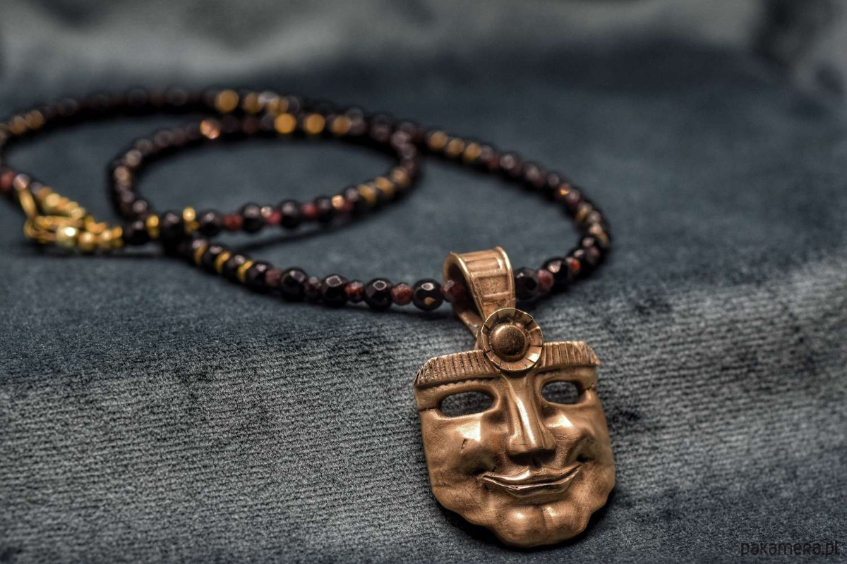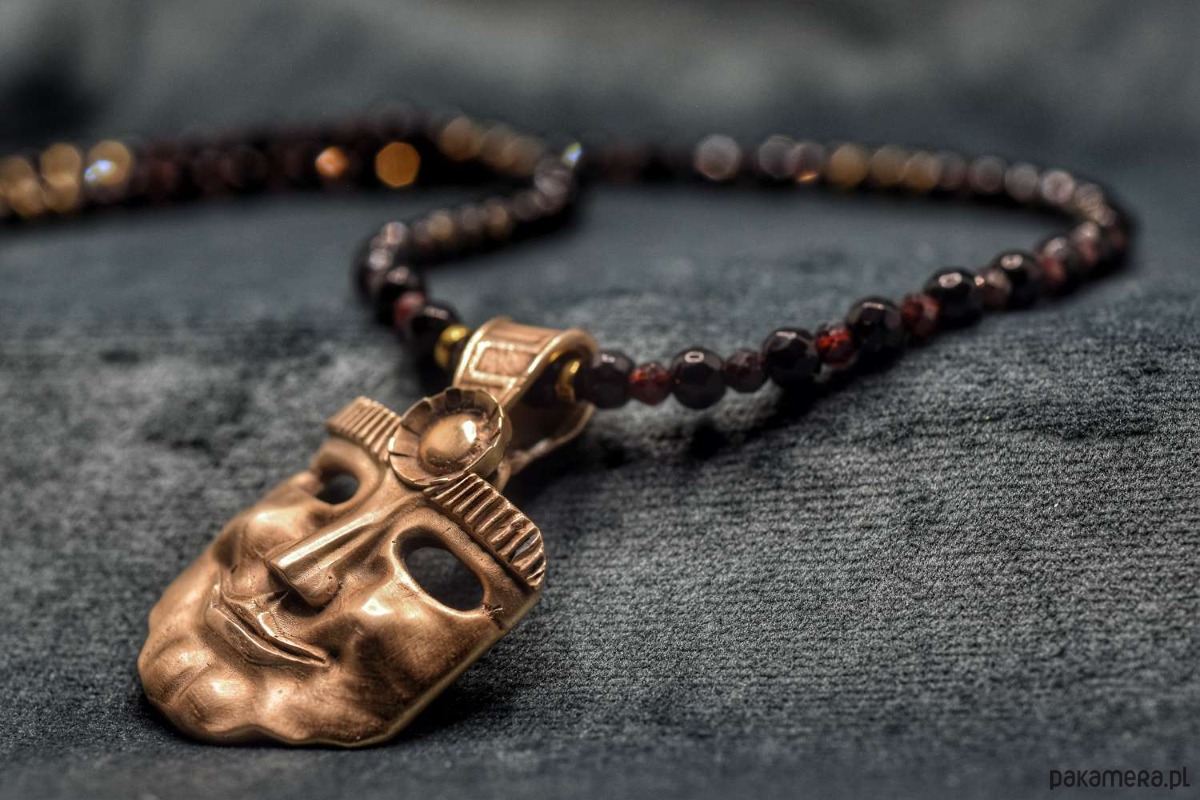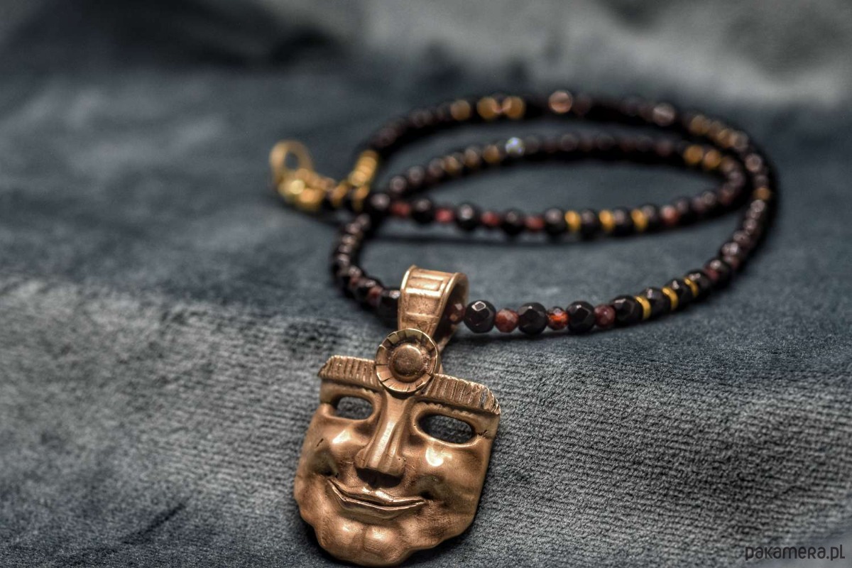 Naszyjnik z projektu "Słońce przywdziałem". Odlany z brązu. Na naturalnych kamieniach. Wisiorek z mieszanym wykończeniem satynowo-błyszczącym.