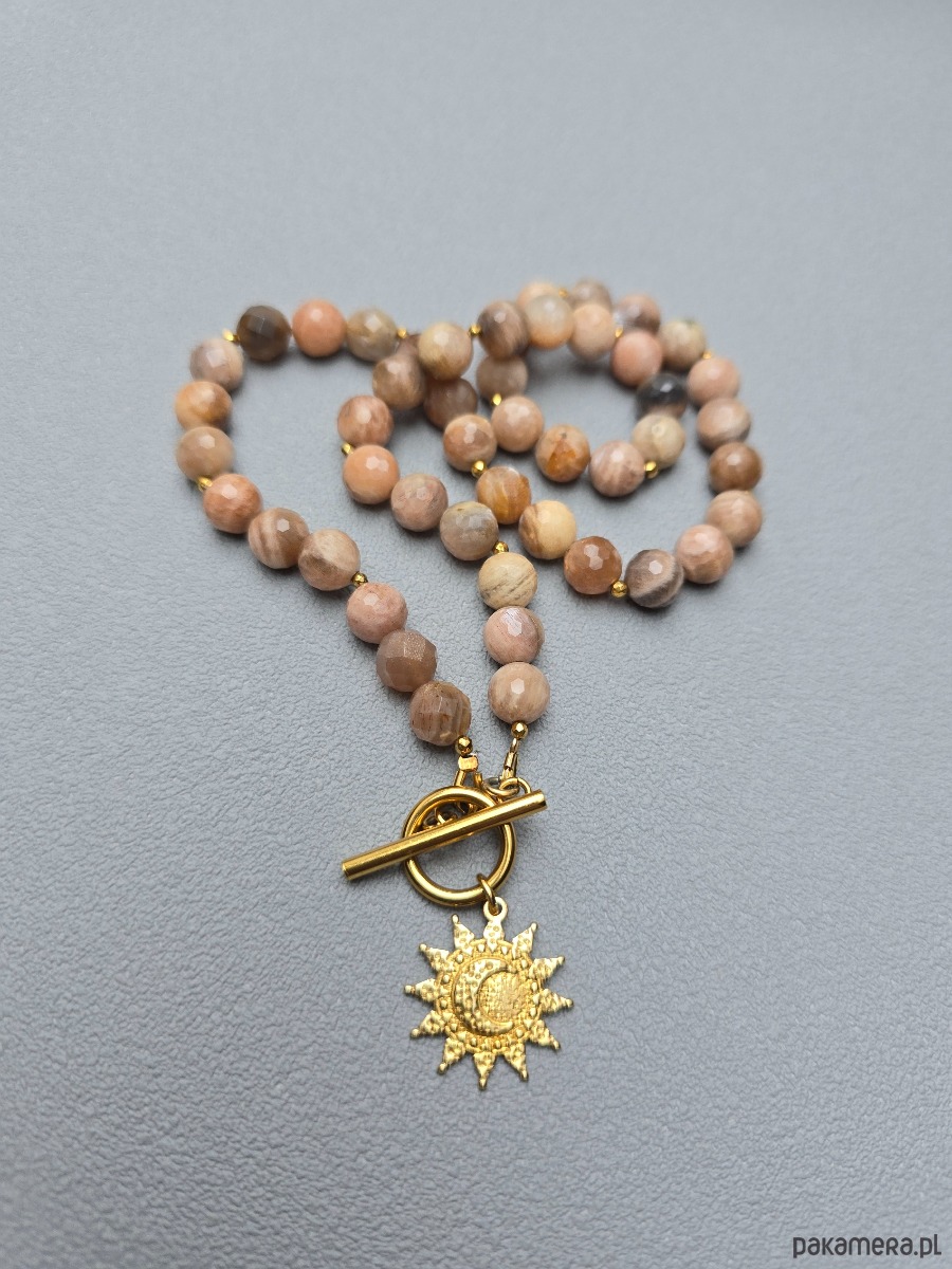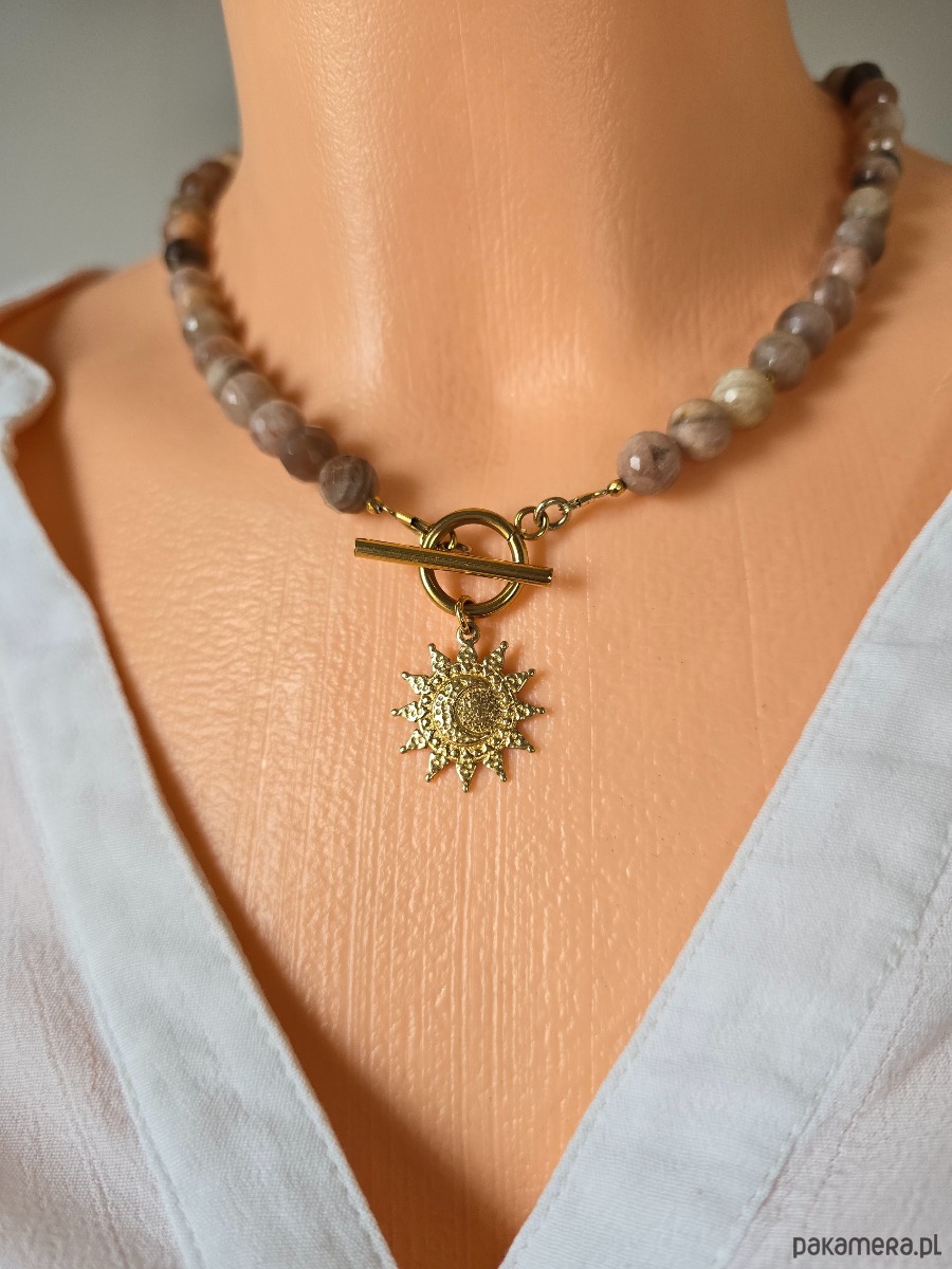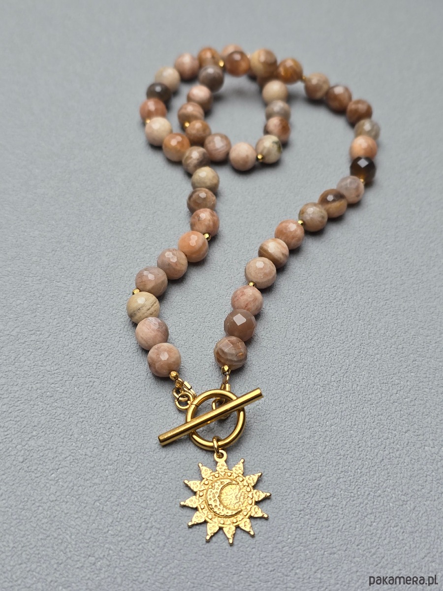 Piękny naszyjnik w najmodniejszym w tym sezonie, beżowym kolorze. Wykończony w stali szlachetnej złoconej z elementami srebra złoconego ( zawieszka słoneczko)