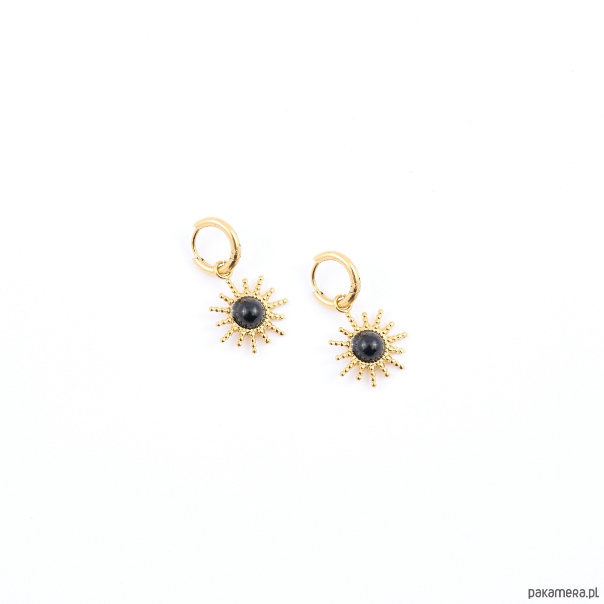 Centralny element zdobi czarny kamień o lustrzanym połysku, który pięknie kontrastuje ze złotą oprawą. To elegancki detal, który podkreśla pewność siebie i subtelny magnetyzm. Każdy ruch sprawia, że kolczyki delikatnie odbijają światło, tworząc wrażenie ciepłego, słonecznego blasku.