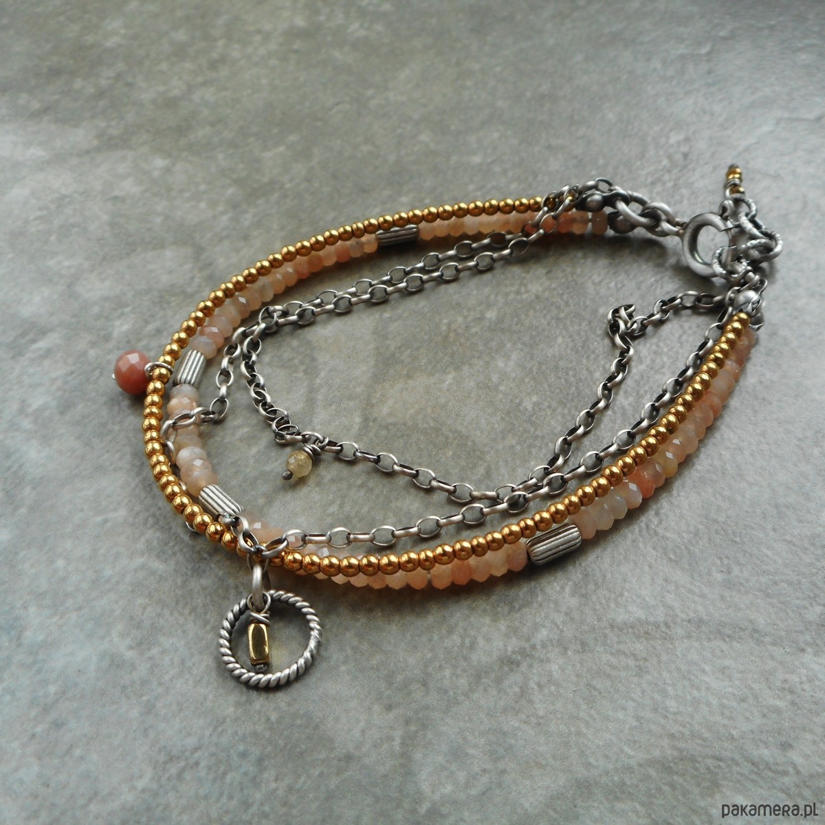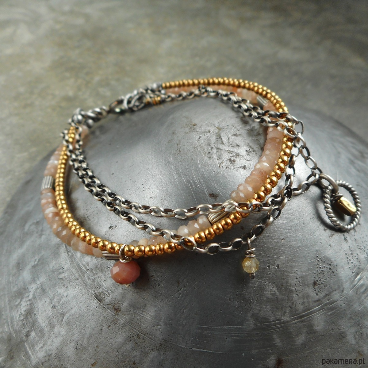 Wyjątkowa bransoletka z kamieni naturalnych i szlachetnego srebra; składa się z czterech sznurów - kamieni i łańcuszków, ozdobiona zawieszkami. Do kompletu polecam kolczyki dostępne w mojej galerii.