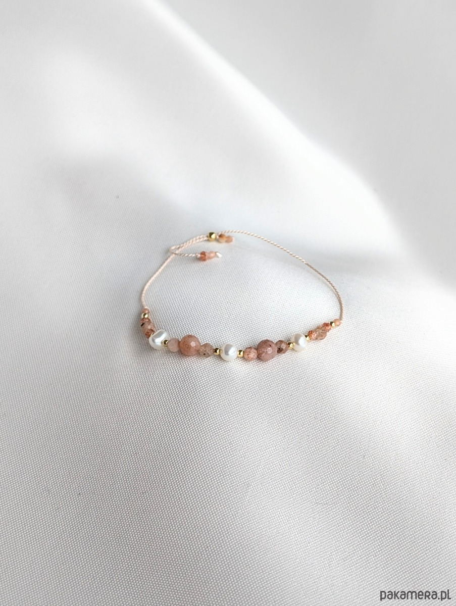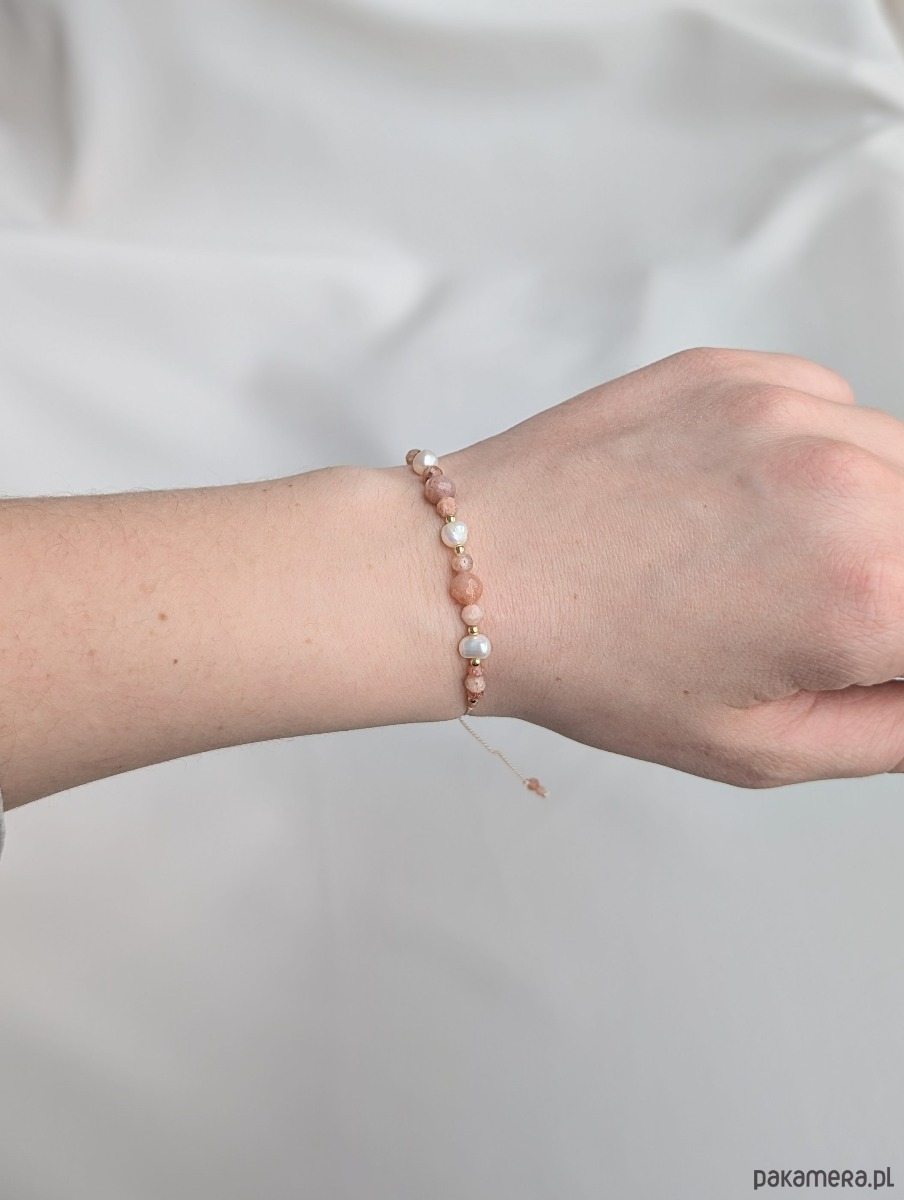 Bogato zdobiona bransoletka z kamieni słonecznych różnych rozmiarów, naturalnych pereł oraz pozłacanych elementów dekoracyjnych.