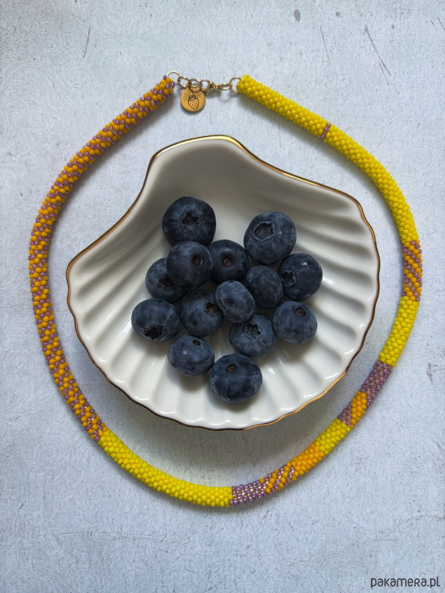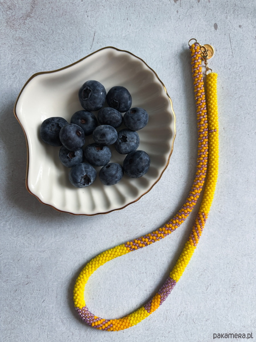 Słoneczna Jagoda — ręcznie wykonany naszyjnik z koralików Toho 11/0, inspirowany letnim słońcem i słodkim aromatem jagód. Każdy egzemplarz to unikalna kompozycja barw, gdzie ciepłe odcienie żółci przeplatają się z soczystymi fioletem i błękitami, tworząc subtelny, radosny nastrój.