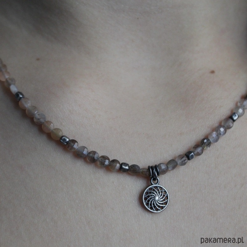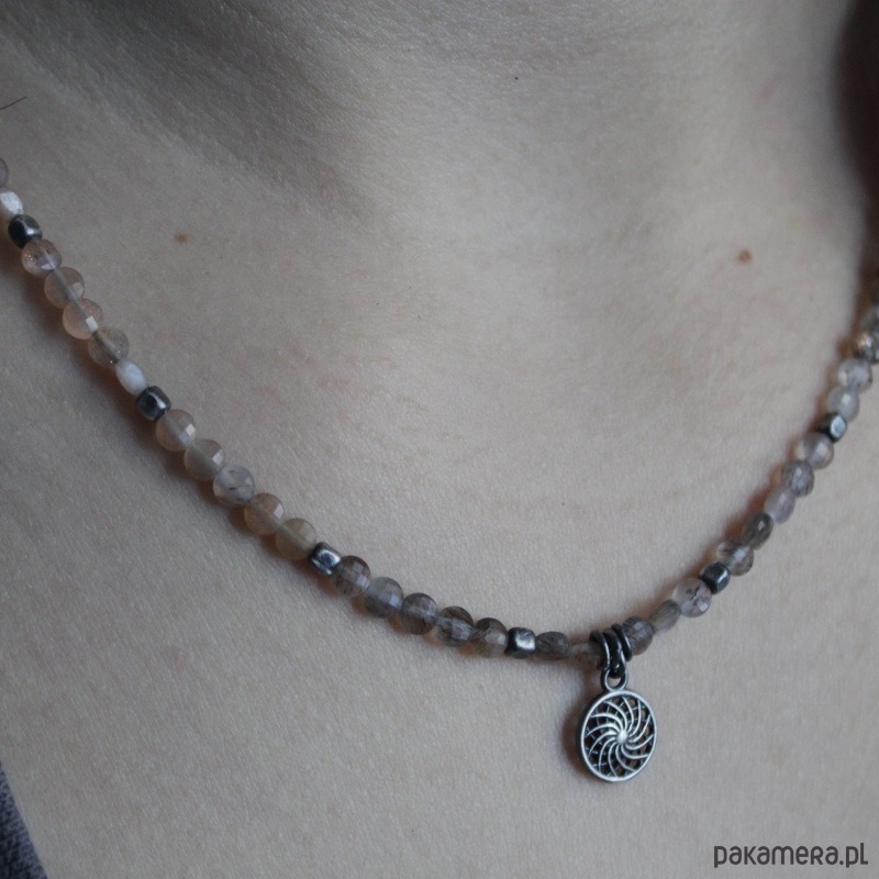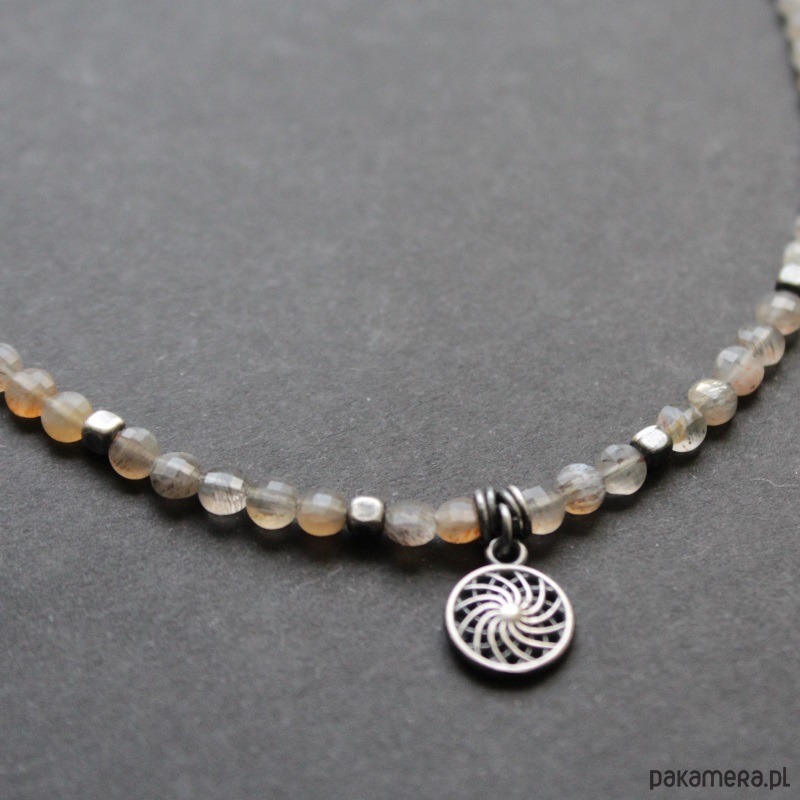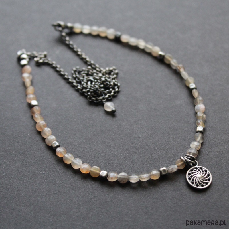Piękny naszyjnik wykonany został z oksydowanego srebra próby 925 oraz przepięknych fasetowanych kamieni słonecznych wielkości 0,4 cm.