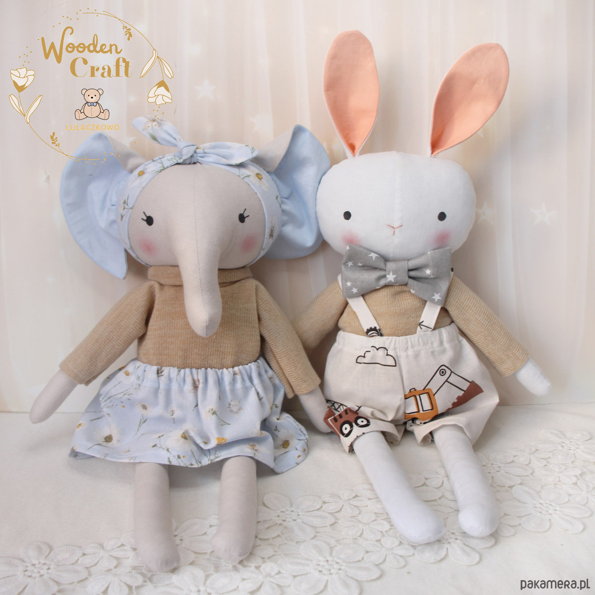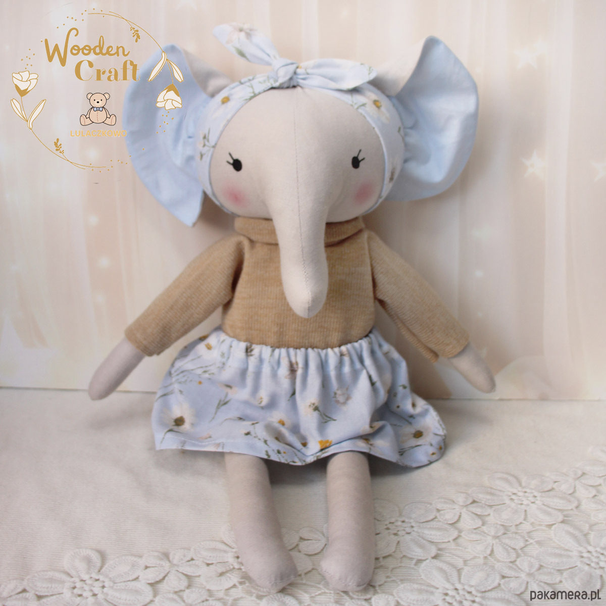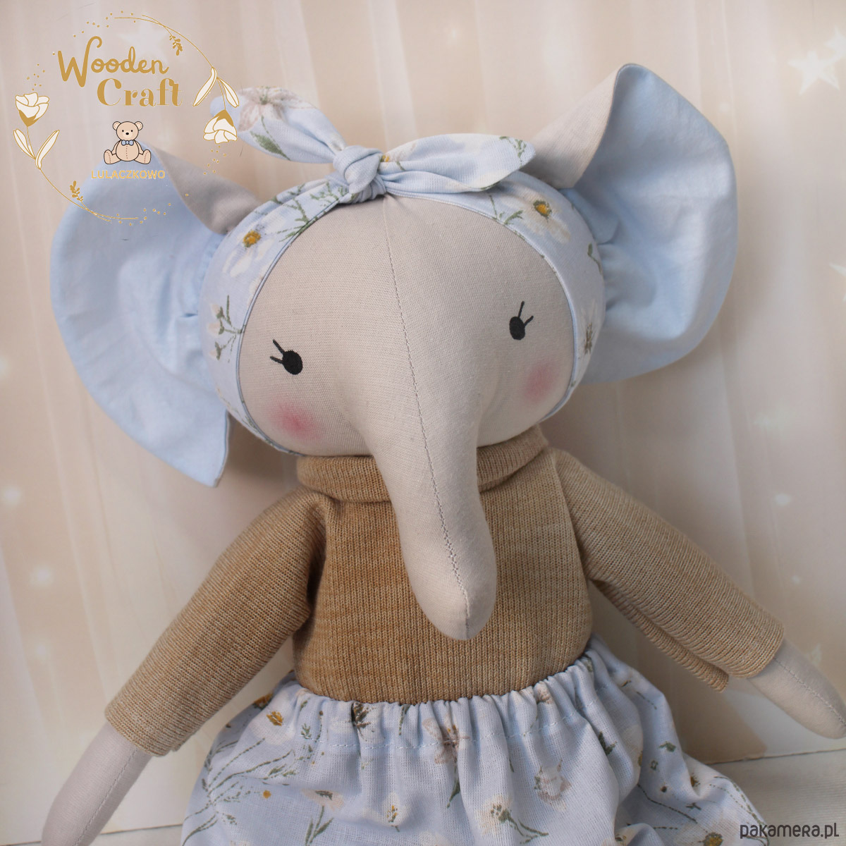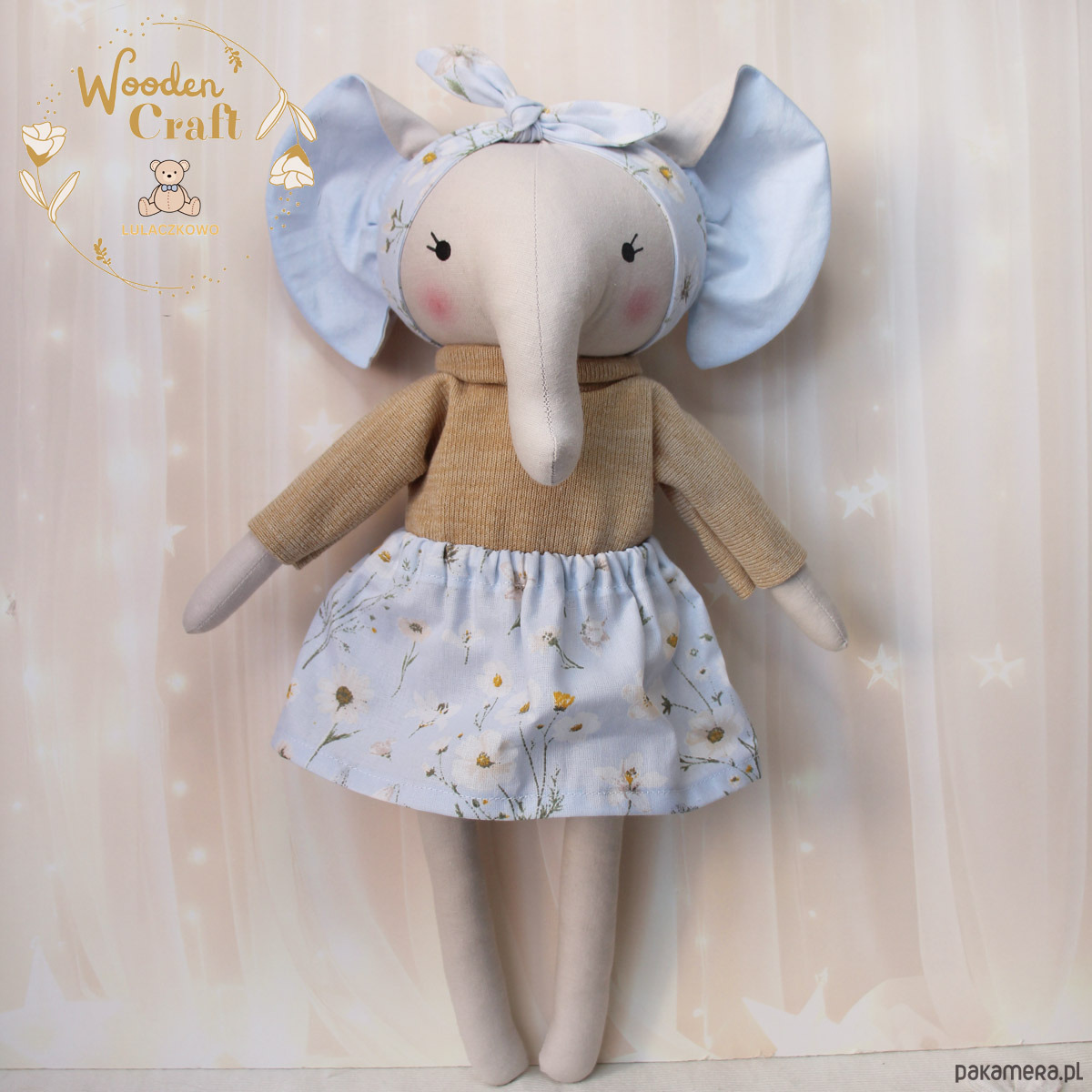 Przeurocza przytulanka słonik, a właściwie słoniczka w kolorze szarym, uszyta ręcznie z najwyższą starannością, ubrana w uroczy beżowy sweterek oraz błękitną spódniczkę z motywem stokrotek, z błękitną opaską na głowie. Wykonana ze 100% bawełny, wypełniona antyalergiczną kulką silikonową. Oczka malowane wodoodpornym markerem. Górne i dolne łapki układają się luźno, słoniczka siedzi z podparciem. Zarówno sweterek jak i spódniczkę można swobodnie zdejmować, w pasie jest wciągnięta gumeczka.