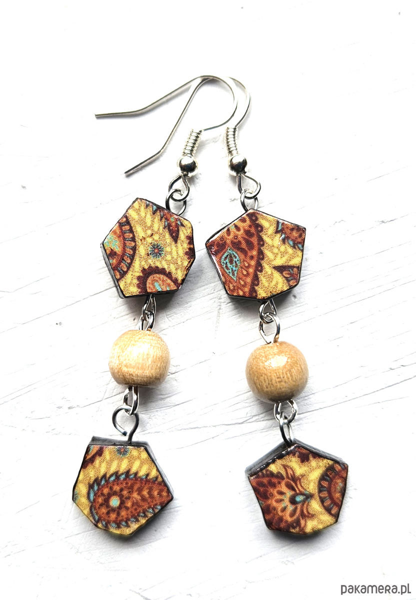 kolczyki drewniane, ozdobione metodą decoupage, dwustronne, starannie wykończone farbami akrylowymi i zabezpieczone wielokrotnie lakierem, bigle posrebrzane, długość kolczyków bez bigli: 5 cm, bardzo lekkie
