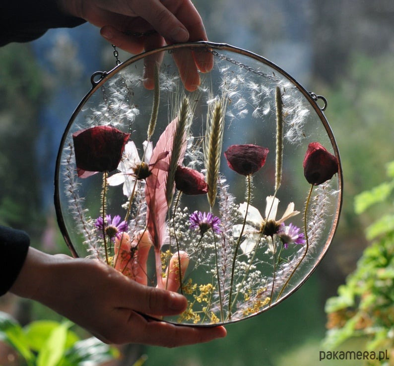 Dekoracyjny witraż z kompozycją z suszonych roślin wykonany w całości w pracowni rękodzieła MARIAELA.