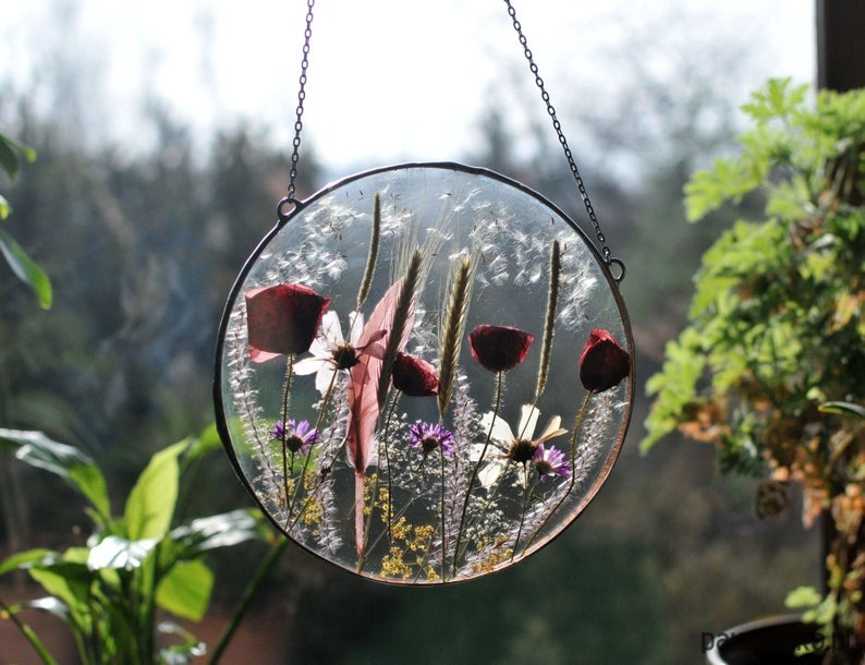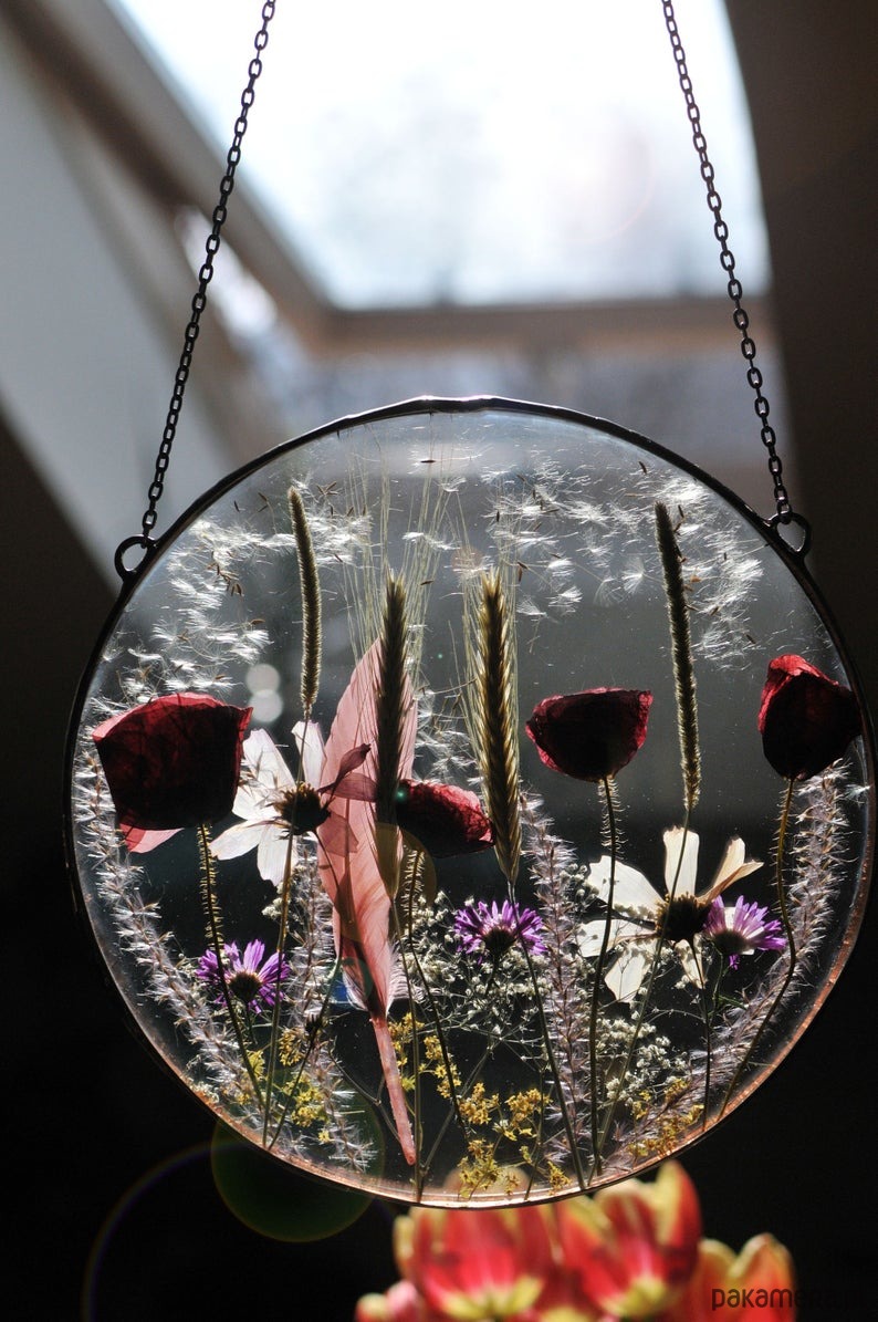 Dekoracyjny witraż z kompozycją z suszonych roślin wykonany w całości w pracowni rękodzieła MARIAELA.