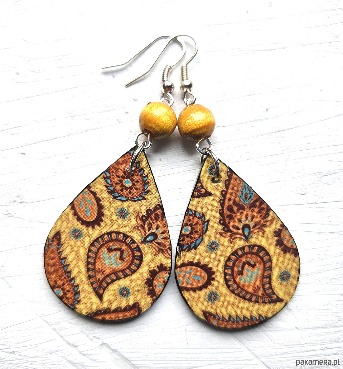 kolczyki drewniane, ozdobione metodą decoupage, dwustronne, starannie wykończone farbami akrylowymi i zabezpieczone wielokrotnie lakierem, koraliki drewniane, bigle posrebrzane, długość kolczyków bez bigli: 5,5 cm, szerokość: 3 cm, bardzo lekkie