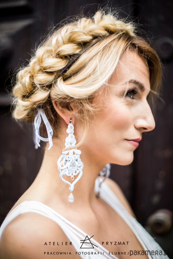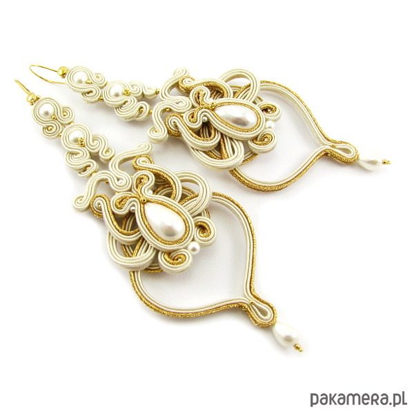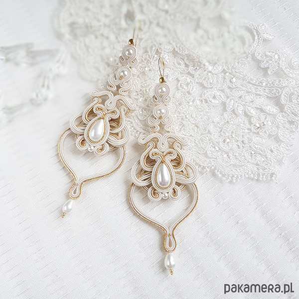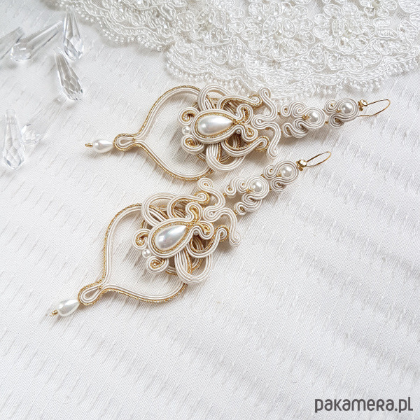 ***ZAMÓW PODOBNE***Jedyne w swoim rodzaju, bogato zdobione, pełne przepychu sutaszowych ornamentów kolczyki ślubne. Wyhaftowane z jedwabistego sutaszu w kolorze bieli ecru. Serce tej niecodziennej biżuterii stanowią perły Seashel. Pomiędzy pasma sutaszu wkomponowałam złociste koraliki Toho i maleńkie, transparentne kropelki Preciosa. Kolczyki są dwustronne a tył mają tylko punktowo podbity atłasem. sztyfty pozłacane 24K złotem, wysadzane drobniutkimi, 1mm, białymi cyrkoniami.